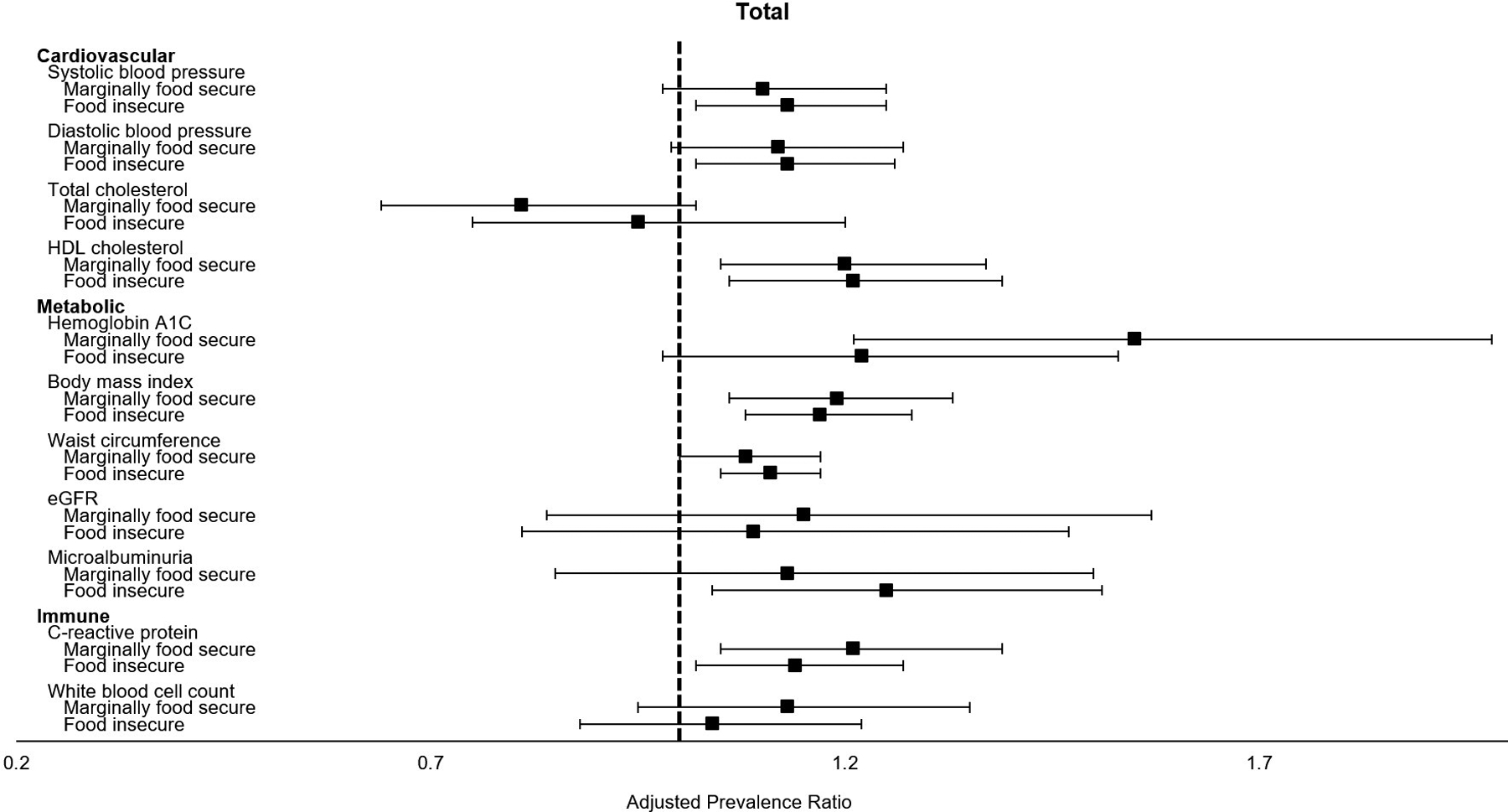 We used data from 7640 US adults in the 2015–2016 and 2017–March 2020 National Health and Nutrition Examination Survey to estimate means and prevalence ratios (PR) for AL scores (based on cardiovascular, metabolic, and immune biomarkers) associated with self-reported household food security status from multivariable linear and logistic regression models.