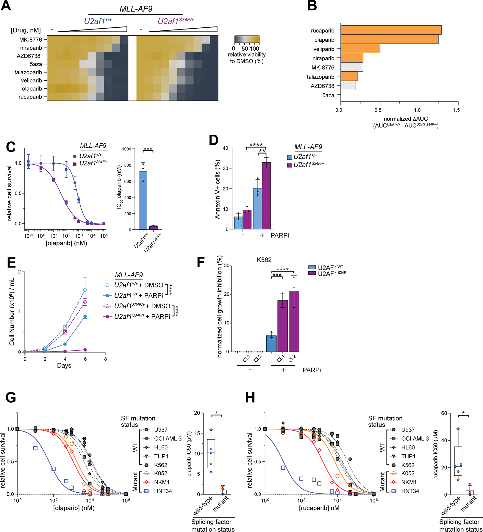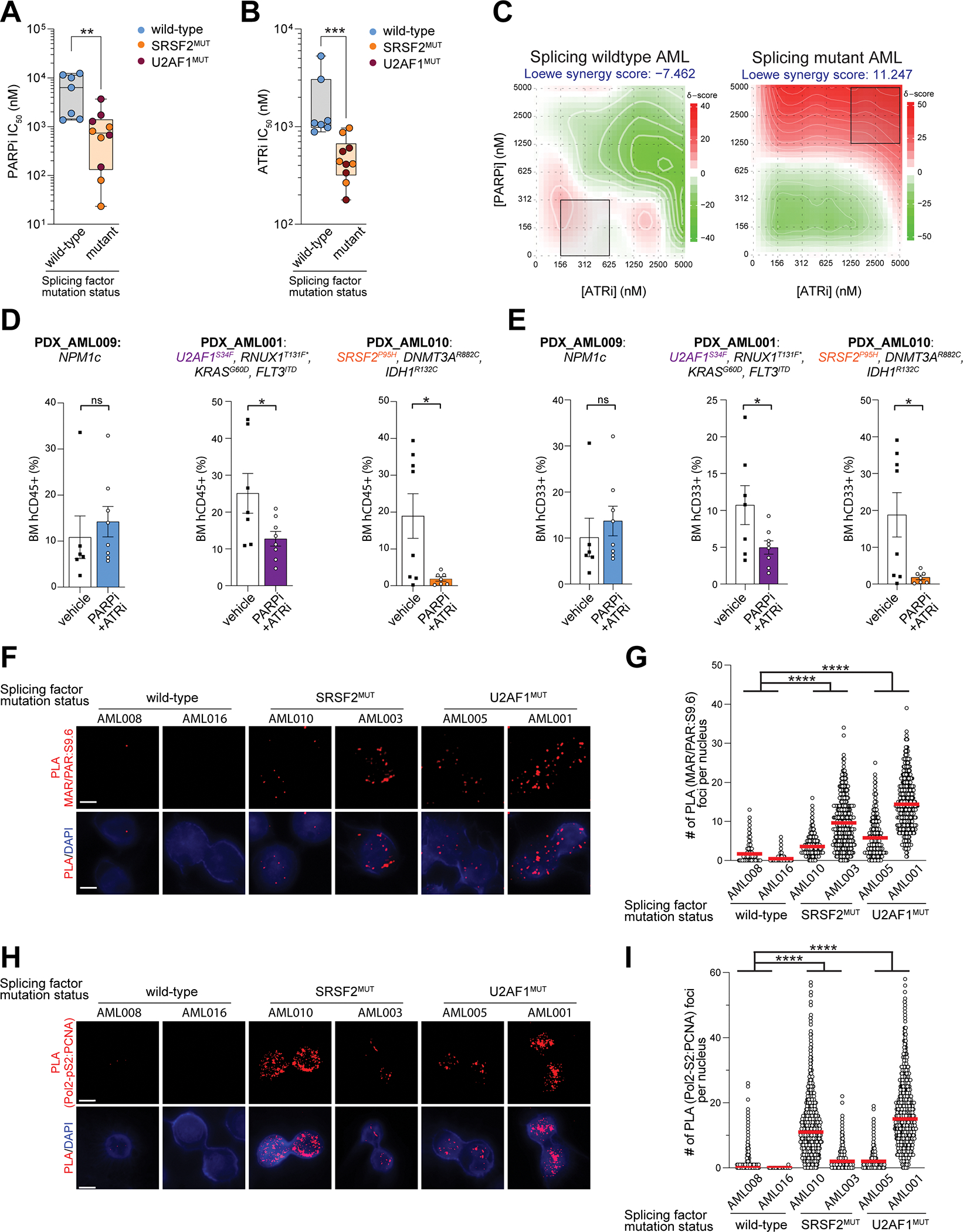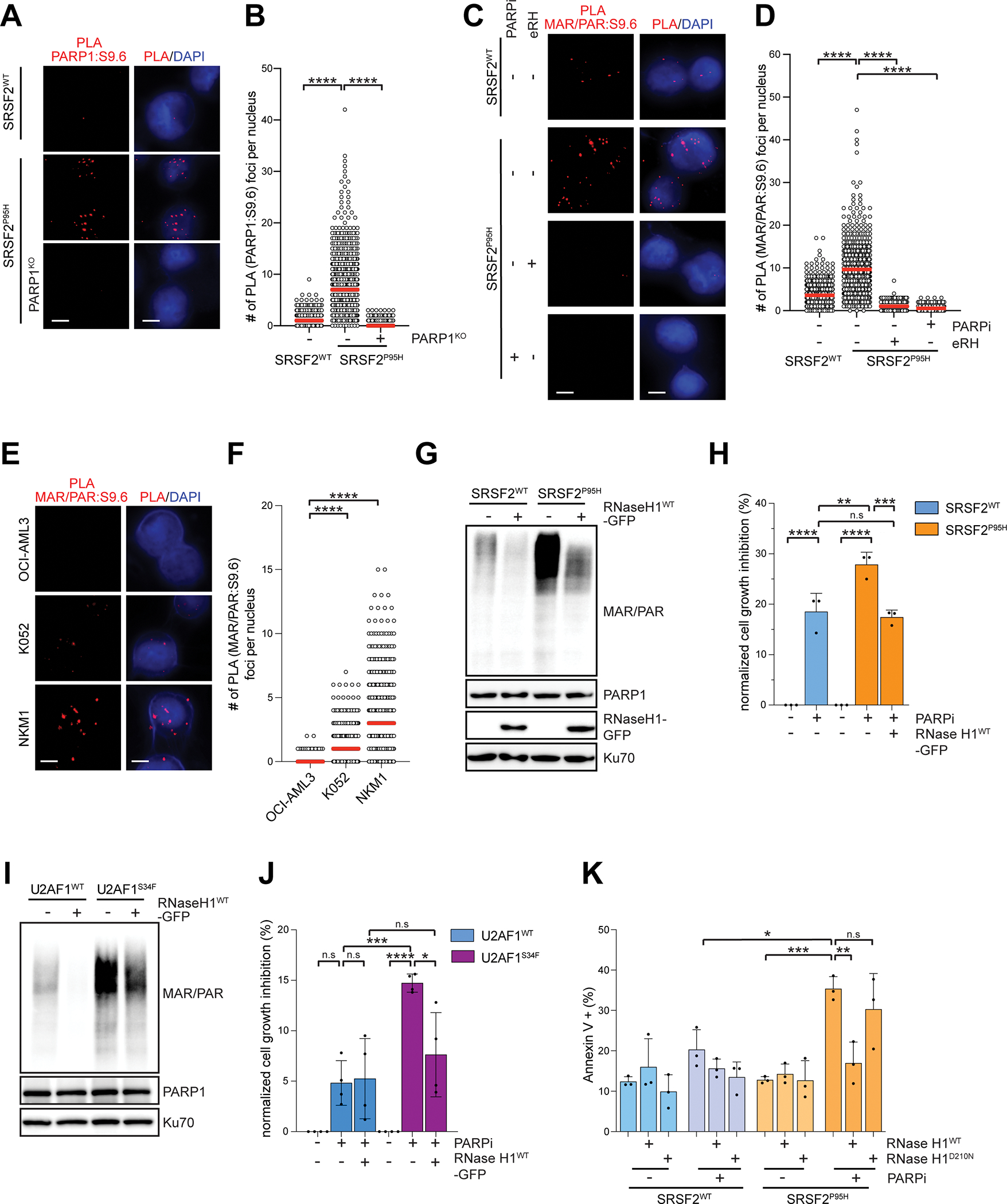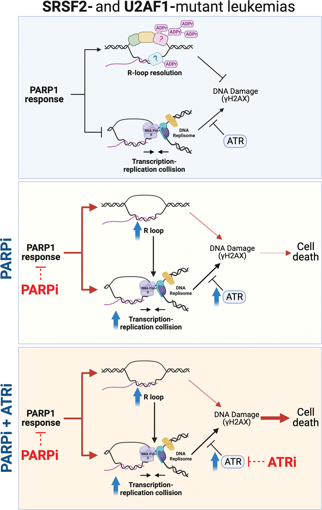 Description:RNA splicing factor (SF) gene mutations are commonly observed in patients with myeloid malignancies. Here we showed that SRSF2- and U2AF1-mutant leukemias are preferentially sensitive to PARP inhibitors (PARPi), despite being proficient in homologous recombination repair. Instead, SF-mutant leukemias exhibited R-loop accumulation that elicited an R-loop-associated PARP1 response, rendering cells dependent on PARP1 activity for survival. Consequently, PARPi induced DNA damage and cell death in SF-mutant leukemias in an R-loop-dependent manner. PARPi further increased aberrant R-loop levels, causing higher transcription-replication collisions and triggering ATR activation in SF-mutant leukemias. Ultimately, PARPi-induced DNA damage and cell death in SF-mutant leukemias could be enhanced by ATR inhibition. Finally, the level of PARP1 activity at R-loops correlated with PARPi sensitivity, suggesting that R-loop-associated PARP1 activity could be predictive of PARPi sensitivity in patients harboring SF gene mutations. This study highlights the potential of targeting different R-loop response pathways caused by spliceosome gene mutations as a therapeutic strategy for treating cancer.|Spliceosome-mutant leukemias accumulate R-loops and require PARP1 to resolve transcription-replication conflicts and genomic instability, providing rationale to repurpose FDA-approved PARP inhibitors for patients carrying spliceosome gene mutations.