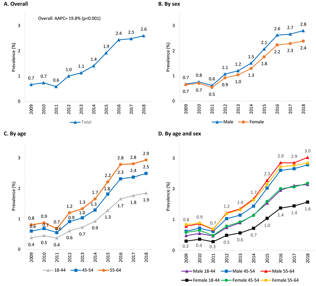 From 2009–2018, there was an increase in the annual prevalence of patients with DME/VTDR (2.1% to 3.4%; AAPC=7.5%; p<0.001) and any DME (0.7% to 2.6%; AAPC=19.8%; p<0.001). There were sex differences in the annual prevalence of DME/VTDR and any DME, with males having a higher prevalence than females. Annual claims for anti-VEGF increased among those with any DME (327%) and VTDR with DME (206%); laser photocoagulation decreased among patients with any DME (−68%), VTDR with DME (−54%), and VTDR without DME (−62%).