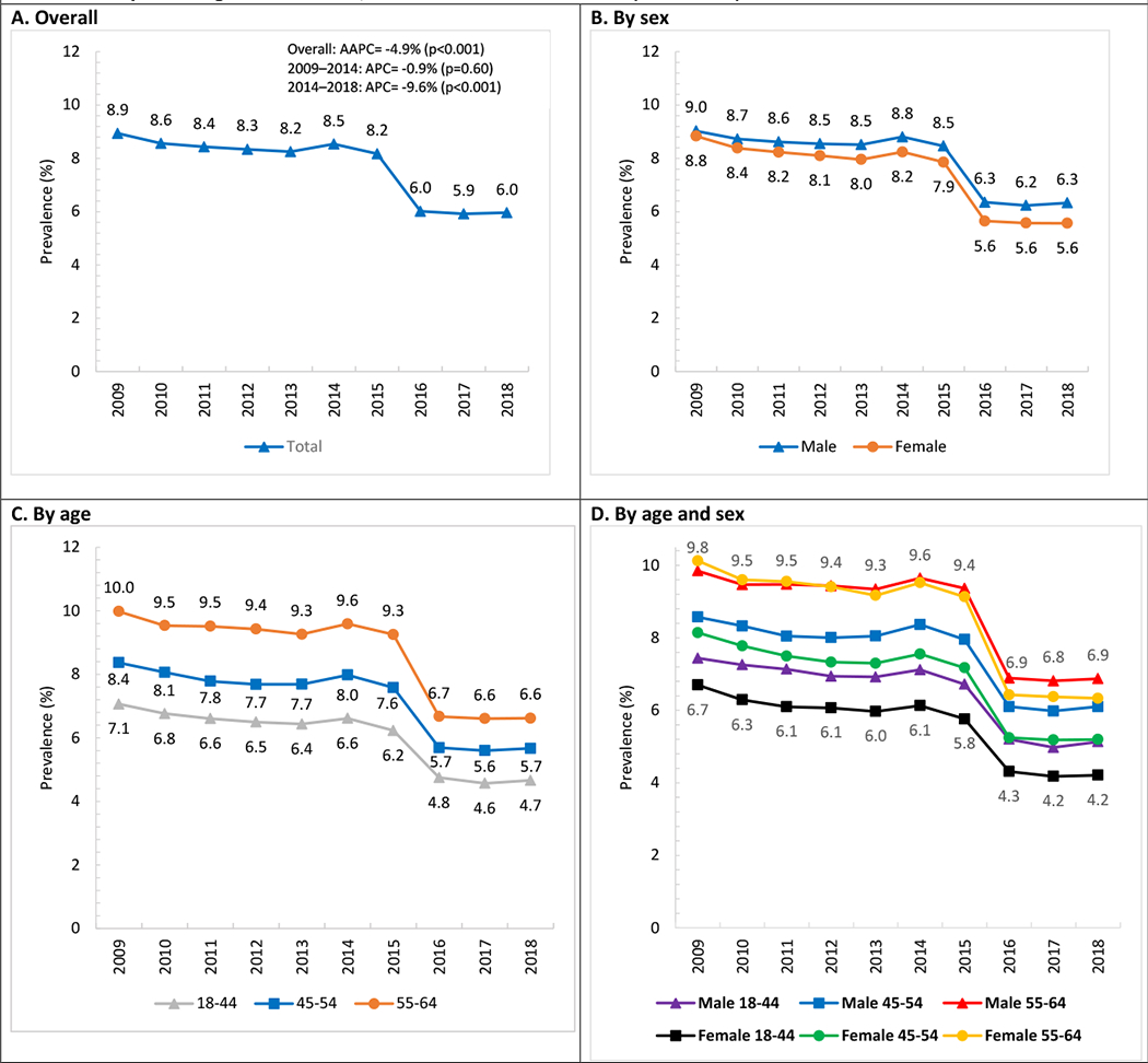 We analyzed the ten-year trend (2009–2018) in healthcare claims for adults 18–64 years using the IBM® MarketScan® Database, a national convenience sample of employer-sponsored health insurance. We included patients continuously enrolled in commercial fee-for-service health insurance for 24 months who had a diabetes ICD-9/10-CM code on ≥1 inpatient or ≥2 different day outpatient claims in the index year or previous calendar year. We used diagnosis and procedure codes to calculate the annual prevalence of patients with ≥1 claims for: 1) any DME, 2) either DME/VTDR, and 3) anti-vascular endothelial growth factor injections [anti-VEGF] and laser photocoagulation treatment, stratified by any DME, VTDR with DME, and VTDR without DME. We calculated Average Annual Percent Change (AAPC).