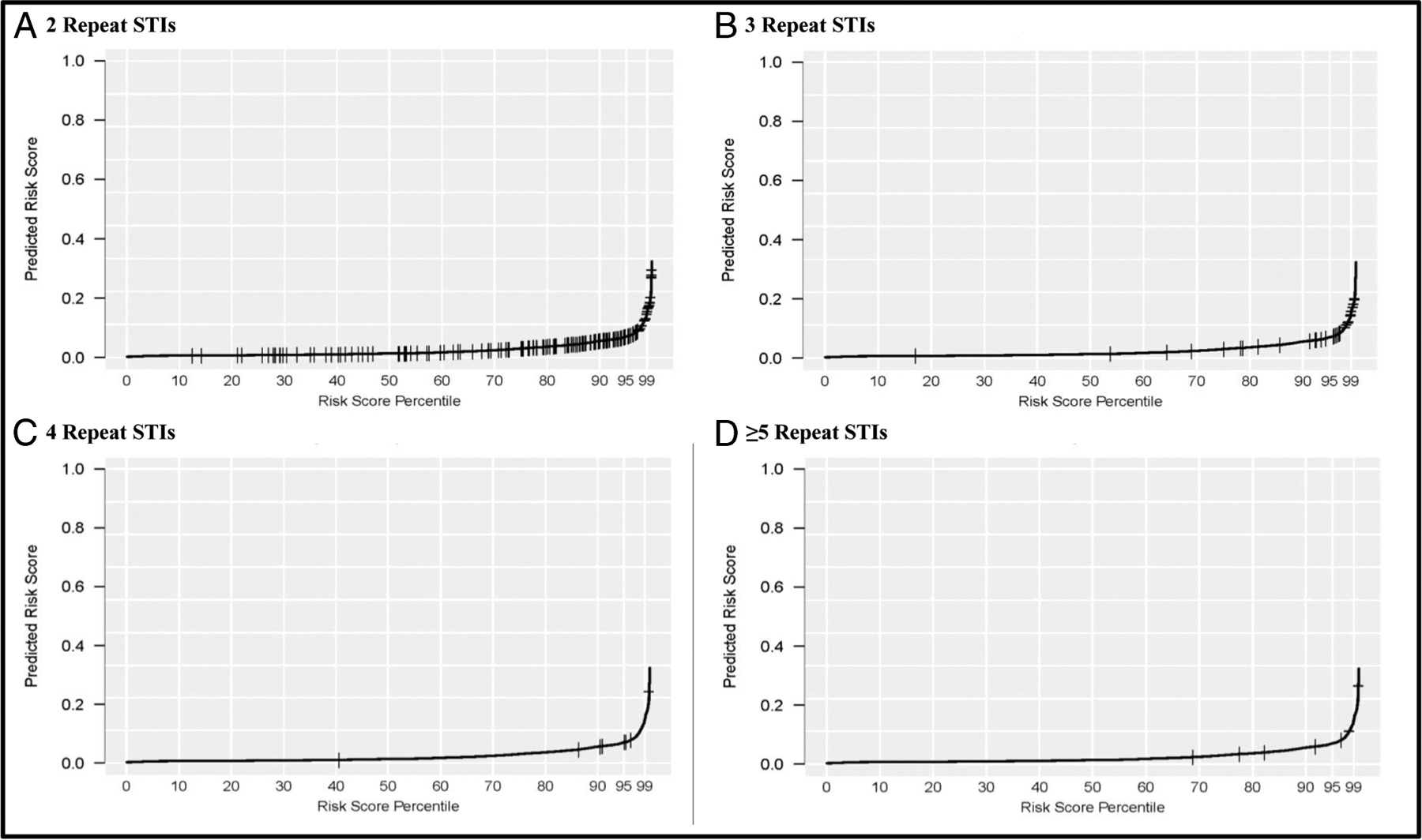 We used structured EHR data on patients 15 years or older who acquired an incident STI diagnosis in 2008 to 2015 in eastern Massachusetts. We applied machine learning algorithms to model risk of acquiring ≥1 or ≥2 additional STIs diagnoses within 365 or 730 days after the initial diagnosis using more than 180 different EHR variables. We performed sensitivity analysis incorporating state health department surveillance data to assess whether improving the accuracy of identifying STI cases improved algorithm performance.