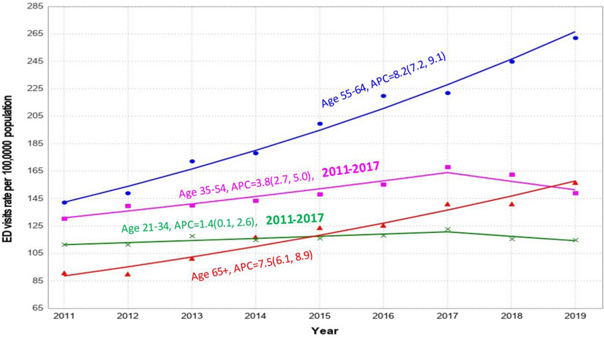 We included emergency department (ED) visits for unintentional fall injuries by adults from the National Electronic Injury Surveillance System-All Injury Program during 2011 to 2020. We estimated the annual national rate of ED visits for alcohol-associated falls and the proportion of these falls among older adults’ fall-related ED visits using demographic and clinical characteristics. Joinpoint regression was performed to examine trends in alcohol-associated ED fall visits between 2011 and 2019 among older adult age subgroups and to compare these trends with those of younger adults.