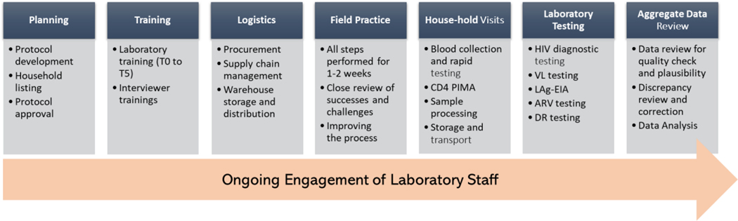 Conducting HIV surveys in resource-limited settings is challenging due to logistics, limited availability of trained personnel, and complexity of testing. We describe procedures and systems deemed critical to ensure high-quality laboratory data in the Population-Based HIV Impact Assessments (PHIA), large-scale household (HH) surveys.