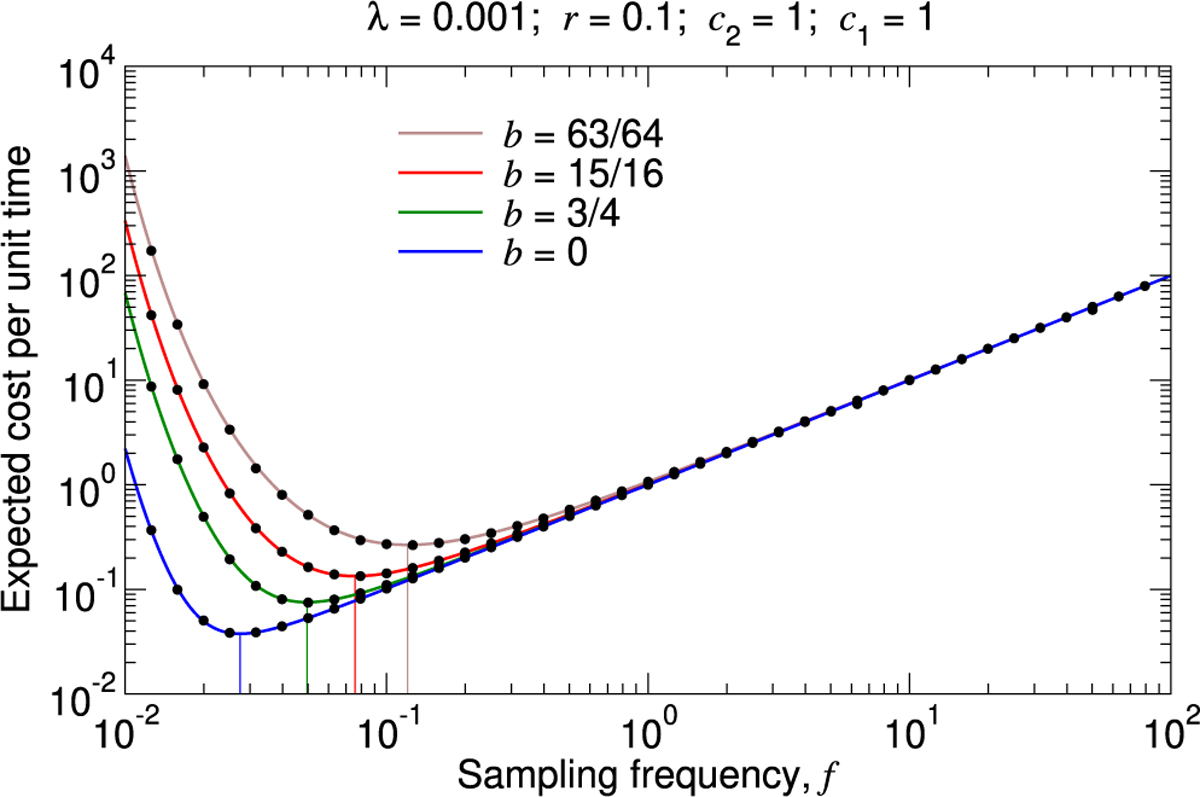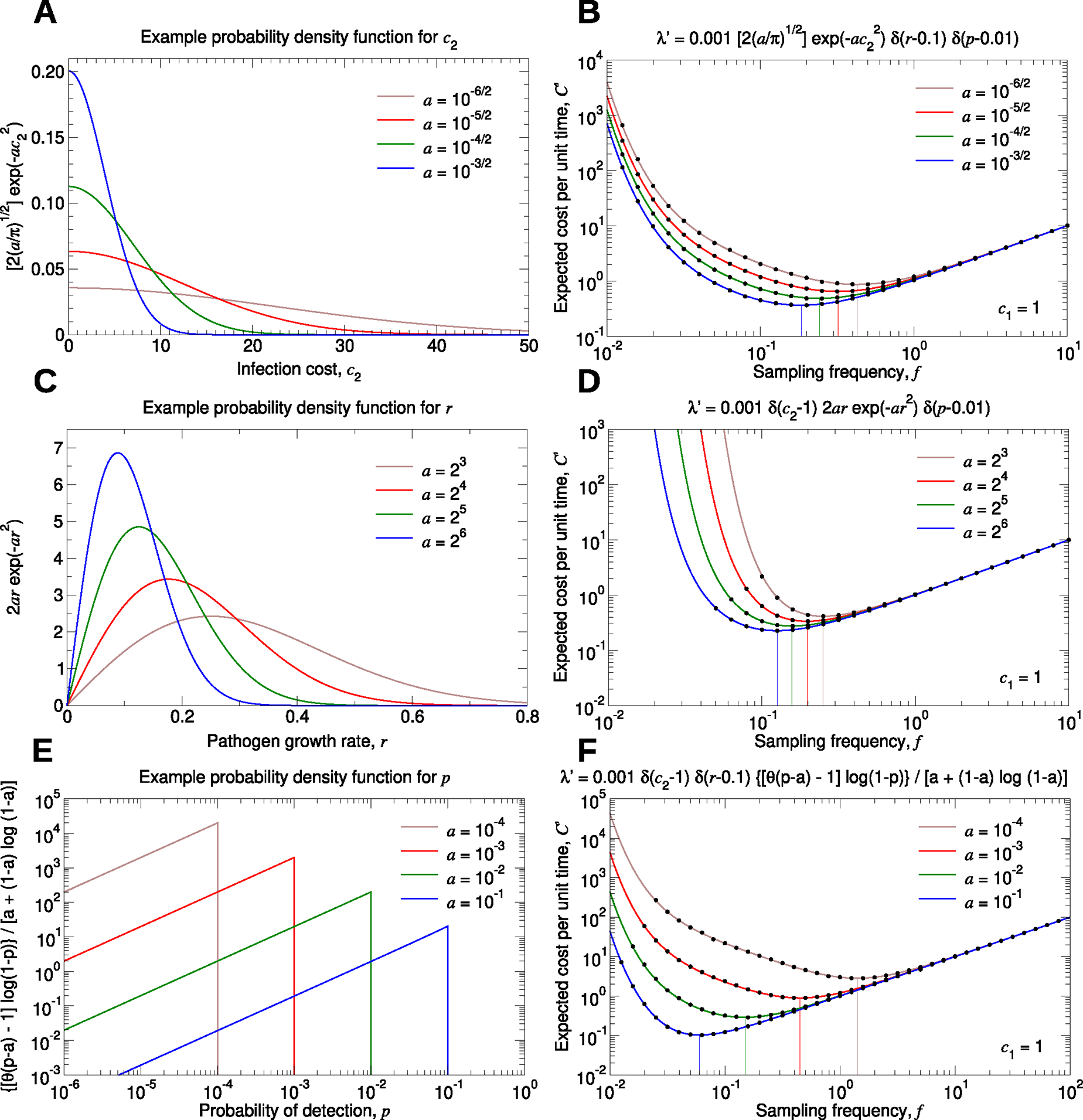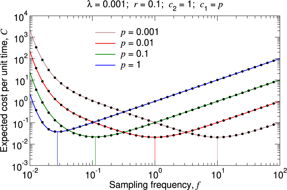 Description:Public health surveillance for pathogens presents an optimization problem: we require enough sampling to identify intervention-triggering shifts in pathogen epidemiology, such as new introductions or sudden increases in prevalence, but not so much that costs due to surveillance itself outweigh those from pathogen-associated illness. To determine this optimal sampling frequency, we developed a general mathematical model for the introduction of a new pathogen that, once introduced, increases in prevalence exponentially. Given the relative cost of infection vs. sampling, we derived equations for the expected combined cost per unit time of disease burden and surveillance for a specified sampling frequency, and thus the sampling frequency for which the expected total cost per unit time is lowest.