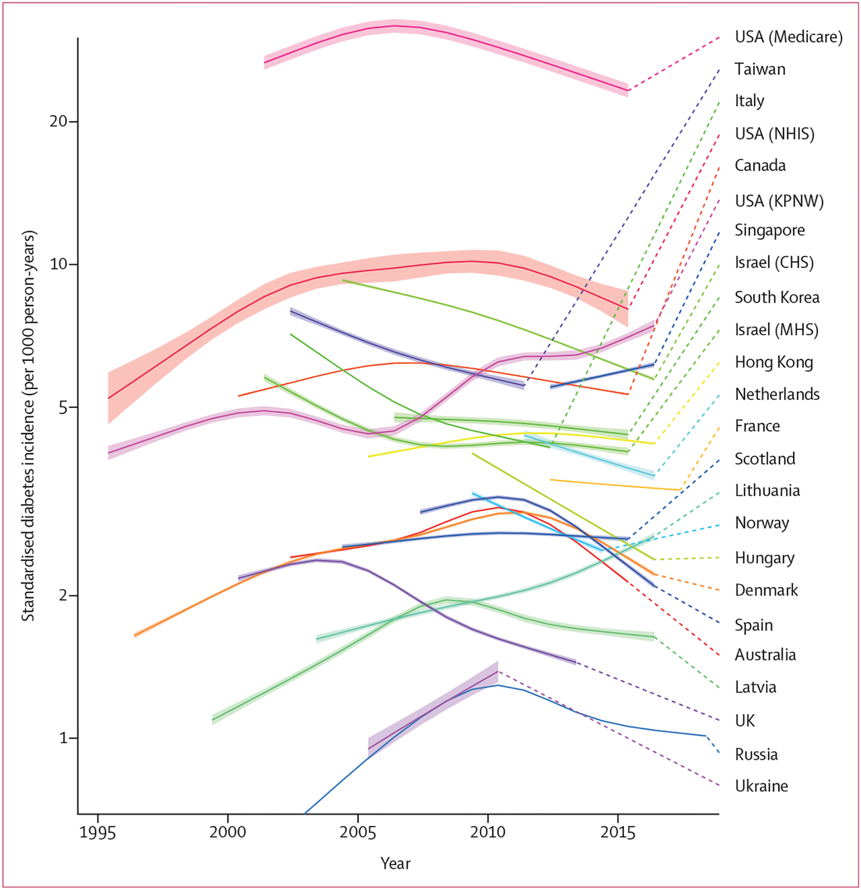 Our data included about 22 million diabetes diagnoses from 5 billion person-years of follow-up. Data were from 19 high-income and two middle-income countries or jurisdictions. 23 data sources had data from 2010 onwards, among which 19 had a downward or stable trend, with an annual estimated change in incidence ranging from −1·1% to −10·8%. Among the four data sources with an increasing trend from 2010 onwards, the annual estimated change ranged from 0·9% to 5·6%. The findings were robust to sensitivity analyses excluding data sources in which the data quality was lower and were consistent in analyses stratified by different diabetes definitions.
