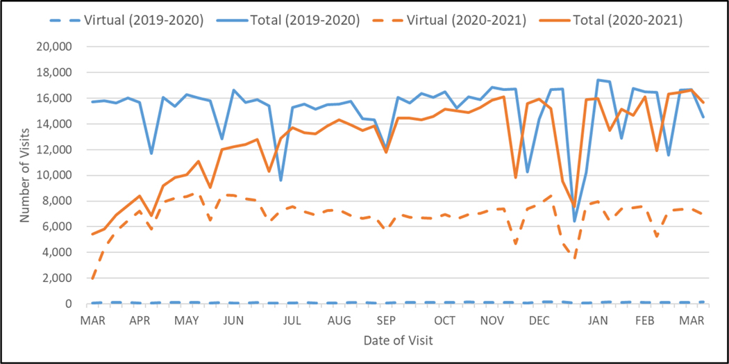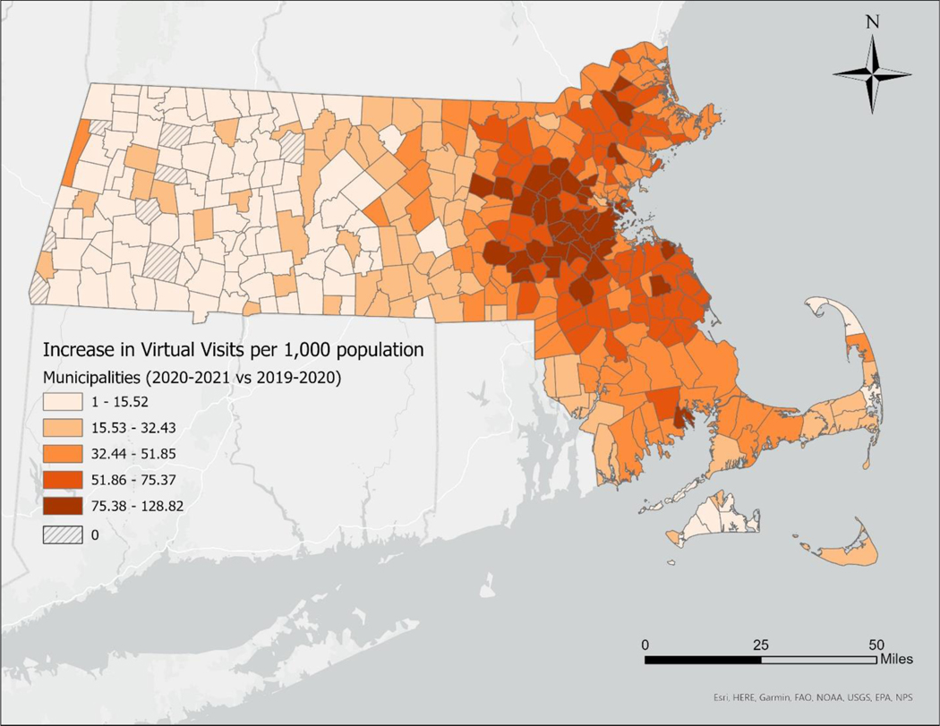 We conducted a retrospective analysis of all virtual medicine patients at a single quaternary-care children’s hospital with a geocoded address in the Commonwealth of Massachusetts prior to (3/16/2019–3/15/2020) and during the COVID-19 pandemic (3/16/2020–3/15/2021). Primary outcomes included patient travel distance, gasoline consumption, carbon dioxide and fine particulate matter emissions as well as savings in main hospital energy use.