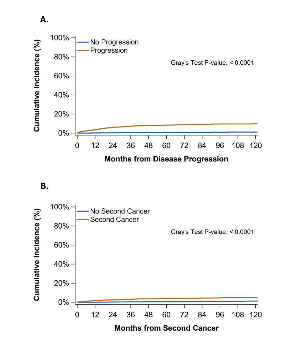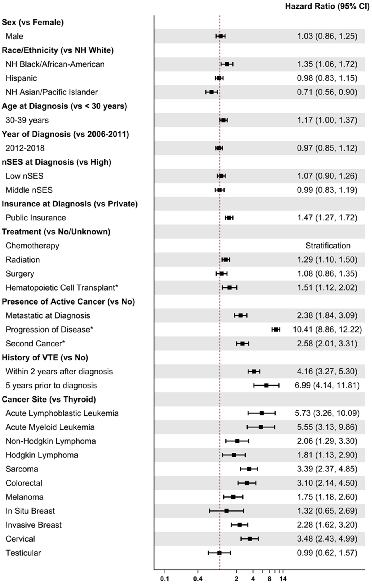 Among 59,343 survivors, the 10-year cumulative incidence of VTE was 1.93% (CI 1.80–2.07). The hazard of VTE was higher among those who had active cancer, including progression from lower stages to metastatic disease (Hazard Ratio (HR)=10.41, 95% confidence interval (CI): 8.86–12.22), second primary cancer (HR=2.58, CI:2.01–3.31), or metastatic disease at diagnosis (HR=2.38, CI:1.84–3.09). The hazard of late VTE was increased among survivors who underwent hematopoietic cell transplantation, those who received radiotherapy, had a VTE history, public insurance (vs private) or non-Hispanic Black/African American race/ethnicity (vs non-Hispanic White). Patients with leukemias, lymphomas, sarcoma, melanoma, colorectal, breast, and cervical cancers had a higher VTE risk than those with thyroid cancer.
