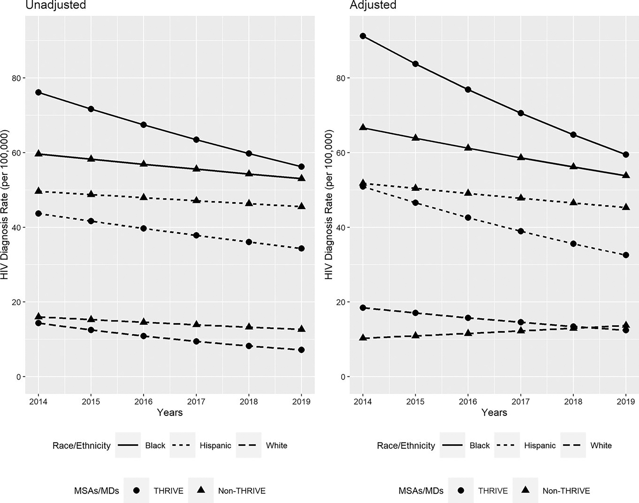 We analyzed National HIV Surveillance System data to determine the number of HIV diagnoses for each year from 2014 to 2019 among Black, Hispanic/Latino, and White MSM in 7 THRIVE-eligible Metropolitan Statistical Areas (MSAs) that were awarded funding and 12 THRIVE-eligible MSAs that were not awarded funding. We used generalized linear Poisson regression models to estimate adjusted estimated annual percentage changes (EAPCs) with 95% confidence intervals for HIV diagnosis rates controlling for HIV prevalence, viral suppression, HIV testing rates, preexposure prophylaxis (PrEP) prescription rates, poverty, education, and insurance status.