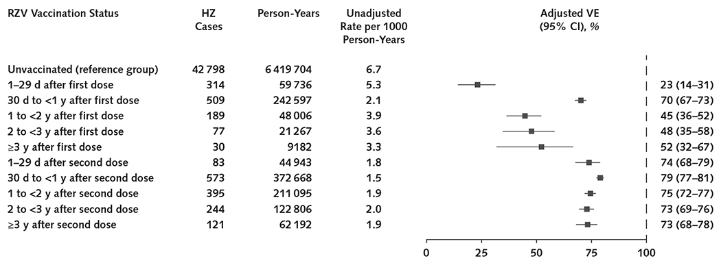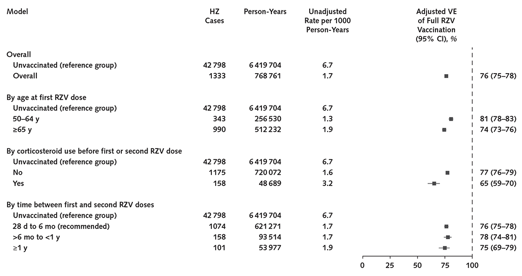 The outcome was incident HZ defined by a diagnosis with an antiviral prescription. Cox regression was used to estimate the hazard of HZ in vaccinated persons compared with unvaccinated persons, with adjustment for covariates. Vaccine effectiveness (VE) was calculated as 1 minus the adjusted hazard ratio and was estimated by time since the last RZV dose and by corticosteroid use.