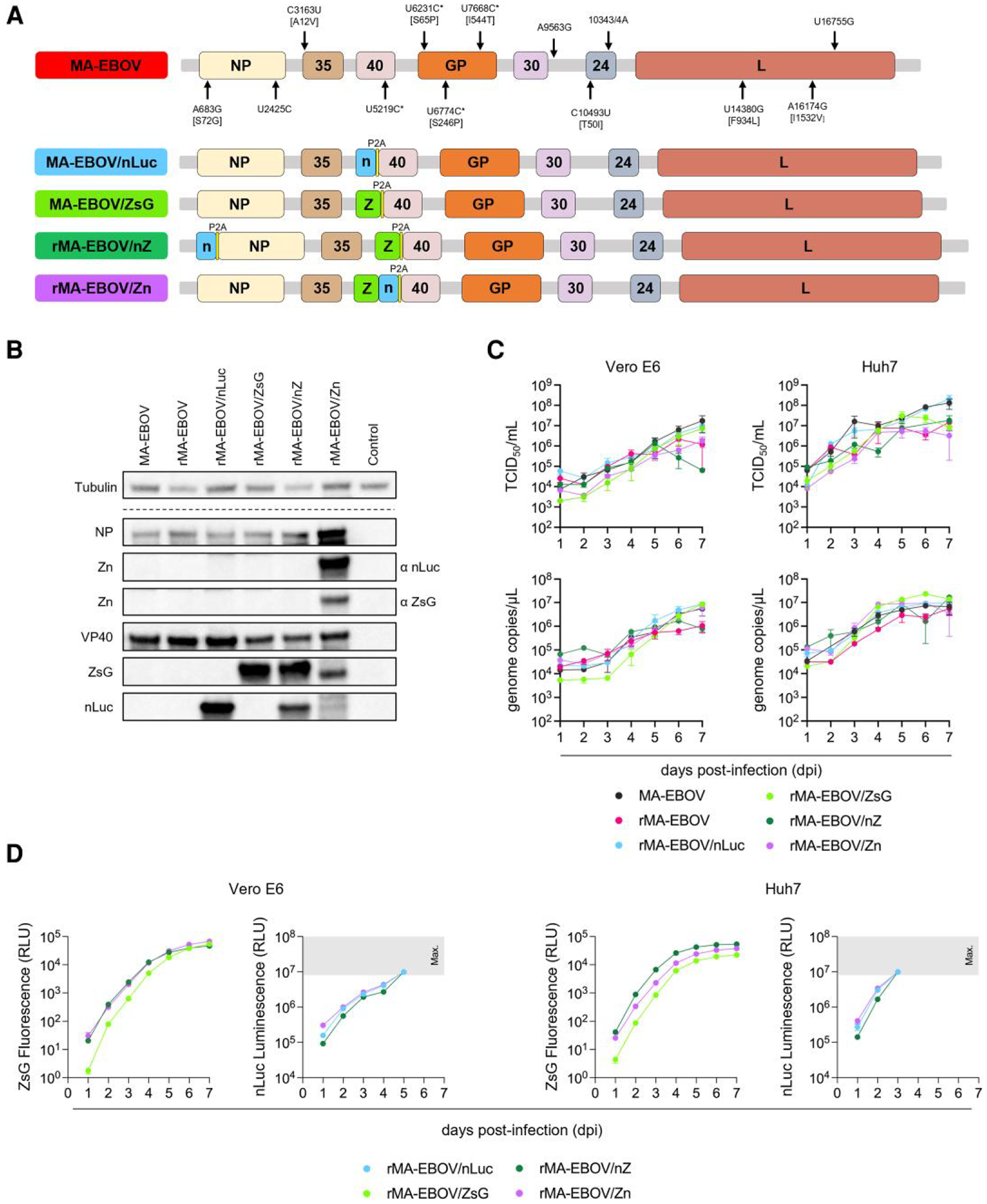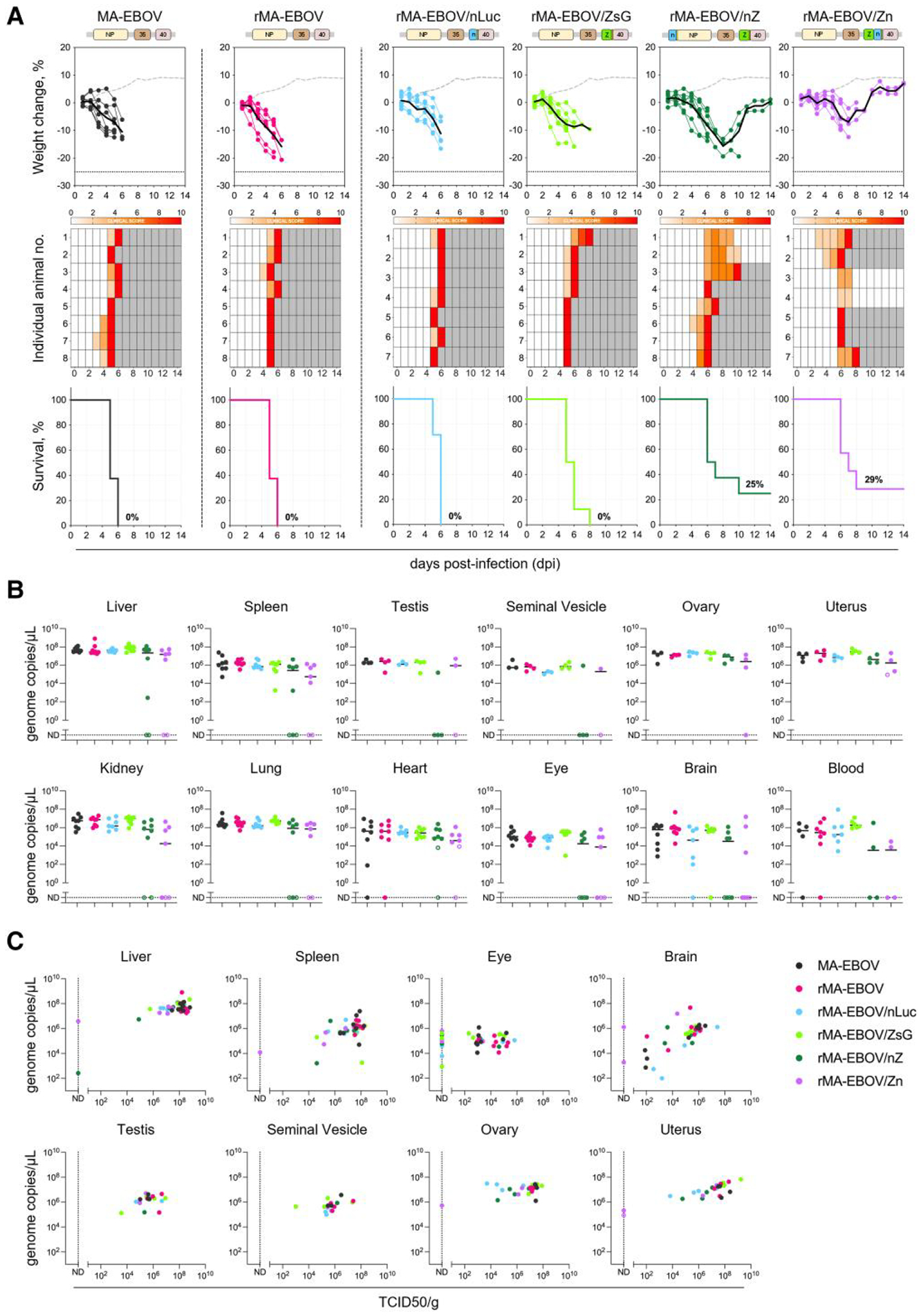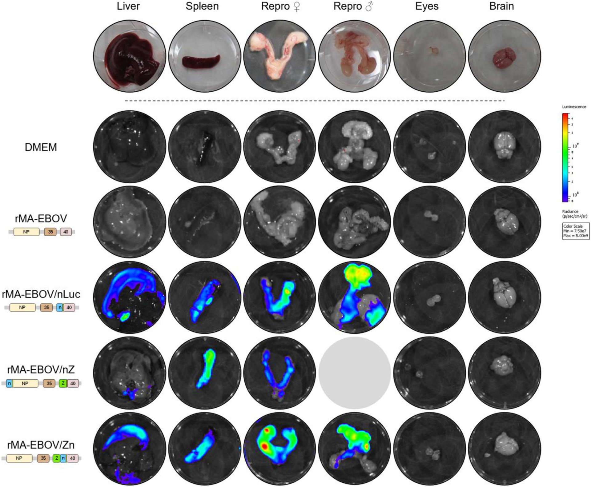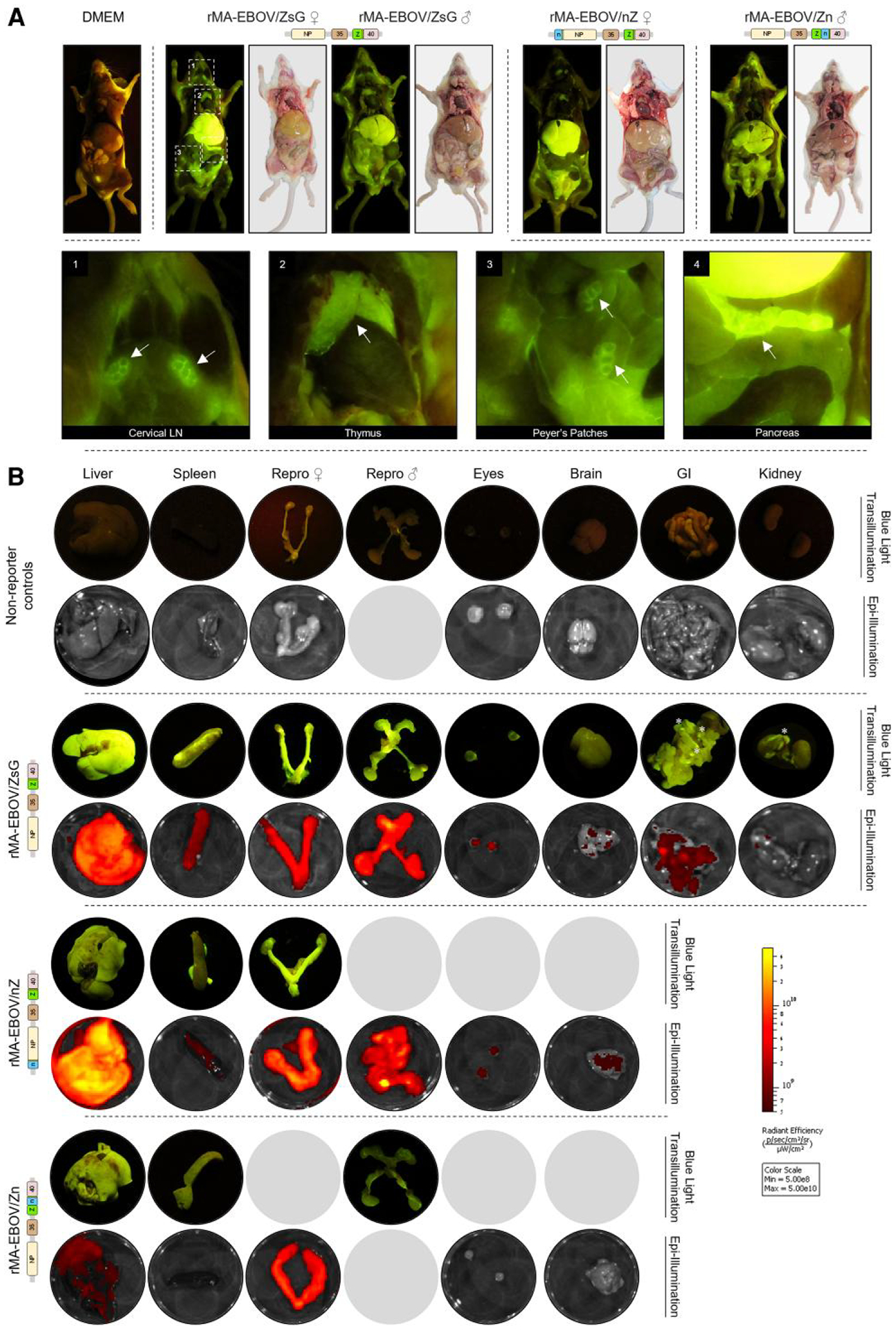 Description:Ebola virus (EBOV) causes lethal disease in humans but not in mice. Here, we generated recombinant mouse-adapted (MA) EBOVs, including 1 based on the previously reported serially adapted strain (rMA-EBOV), along with single-reporter rMA-EBOVs expressing either fluorescent (ZsGreen1 [ZsG]) or bioluminescent (nano-luciferase [nLuc]) reporters, and dual-reporter rMA-EBOVs expressing both ZsG and nLuc. No detriment to viral growth in vitro was seen with inclusion of MA-associated mutations or reporter proteins. In CD-1 mice, infection with MA-EBOV, rMA-EBOV, and single-reporter rMA-EBOVs conferred 100% lethality; infection with dual-reporter rMA-EBOV resulted in 73% lethality. Bioluminescent signal from rMA-EBOV expressing nLuc was detected in vivo and ex vivo using the IVIS Spectrum CT. Fluorescent signal from rMA-EBOV expressing ZsG was detected in situ using handheld blue-light transillumination and ex vivo through epi-illumination with the IVIS Spectrum CT. These data support the use of reporter MA-EBOV for studies of Ebola virus in animal disease models.
