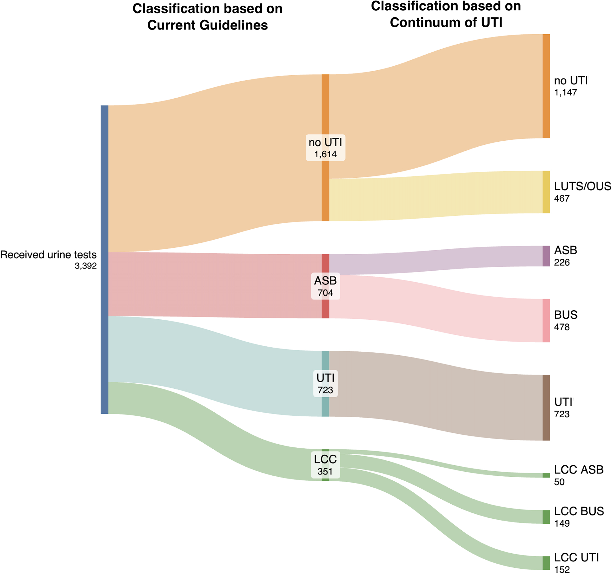 Of 220,531 encounters, 3392 randomly selected encounters were reviewed. Based on the current classification scheme, 32.1% (n=704) had ASB and 53% (n=1614) did not have a UTI. When applying the ‘continuum of UTI’ categories, 68% of patients (n=478) with ASB were reclassified as BUS and 29% of patients (n=467) with ‘no UTI’ were reclassified to LUTS/OUS.