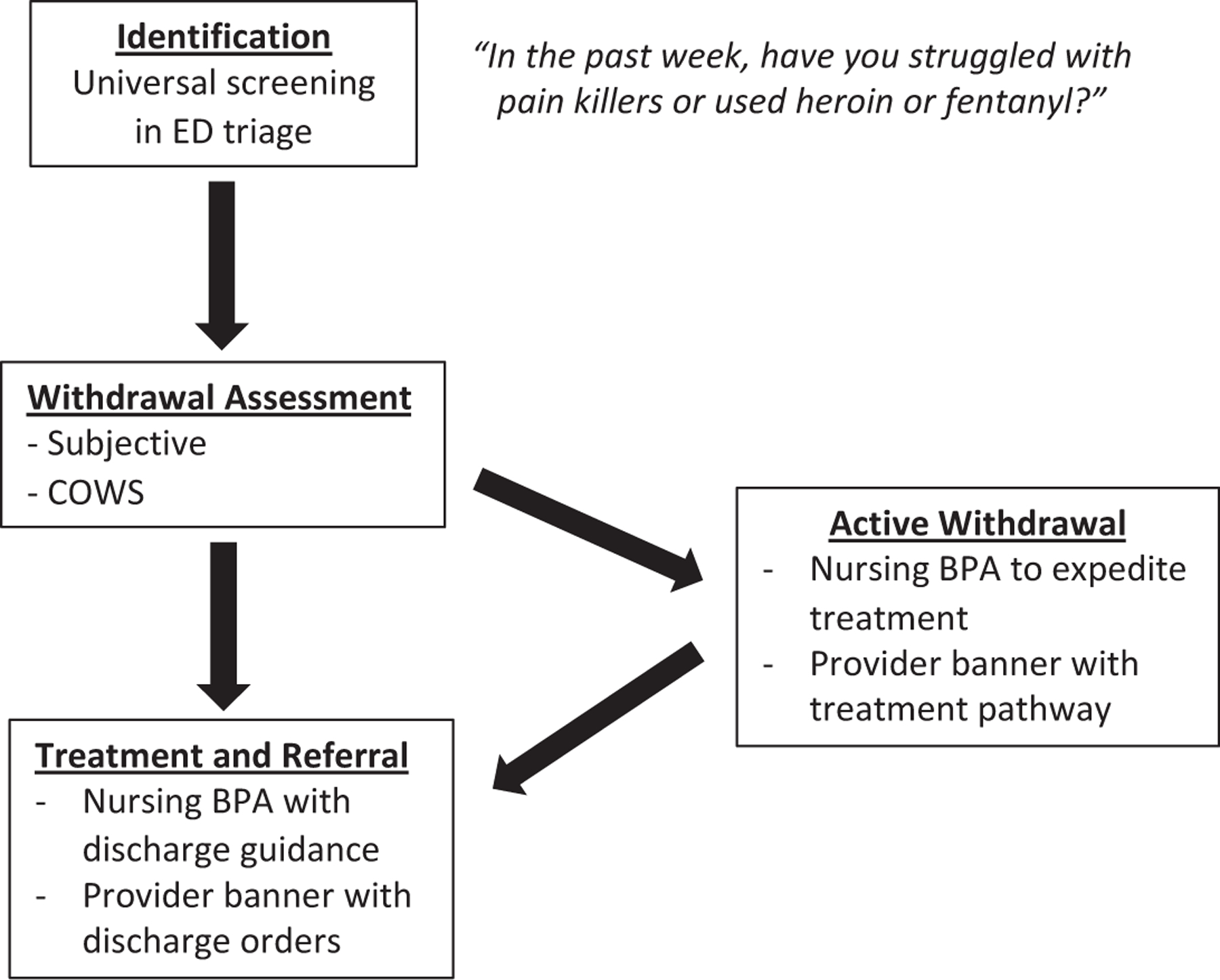 Emergency department (ED)–initiated buprenorphine improves outcomes in patients with opioid use disorder; however, adoption varies widely. To reduce variability, we implemented a nurse-driven triage screening question in the electronic health record to identify patients with opioid use disorder, followed by targeted electronic health record prompts to measure withdrawal and guide next steps in management, including initiation of treatment. Our objective was to assess the impact of screening implementation in 3 urban, academic EDs.