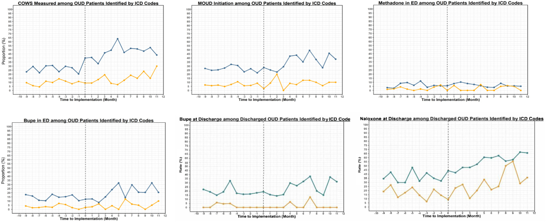 We conducted a quasiexperimental study of opioid use disorder–related ED visits using electronic health record data from January 2020 to June 2022. The triage protocol was implemented in 3 EDs between March and July 2021, and 2 other EDs in the health system served as controls. We evaluated changes in treatment measures over time and used a difference-in-differences analysis to compare outcomes in the 3 intervention EDs with those in the 2 controls.