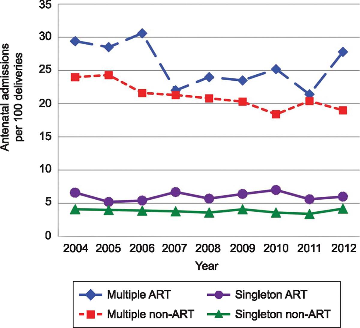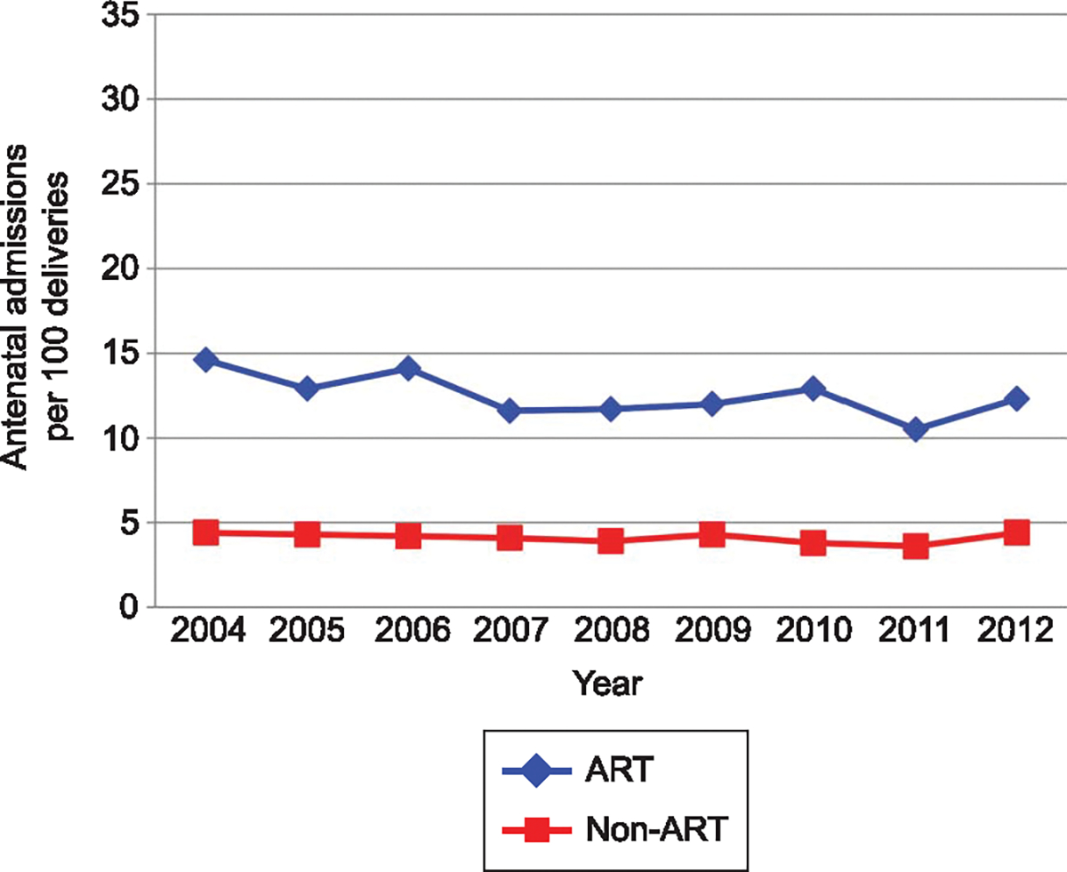 We performed a retrospective cohort analysis using linked ART surveillance, vital records, and hospital discharge data from Michigan to calculate the hospitalization ratio as the number of antenatal admissions per 100 live birth deliveries for ART and non-ART deliveries during 2004–2012 and compare trends by ART status. We then restricted analysis to 2008–2012 and used logistic, multinomial, and Poisson regression analysis to model antenatal admissions, trimester of admission, and length of stay, respectively, for ART compared with non-ART deliveries. We examined reason for hospitalization by ART status.