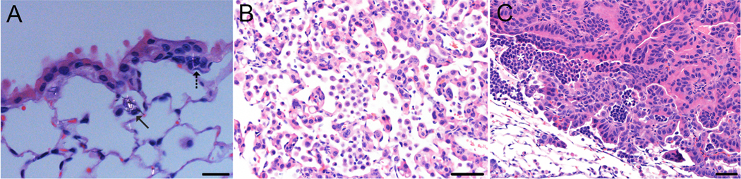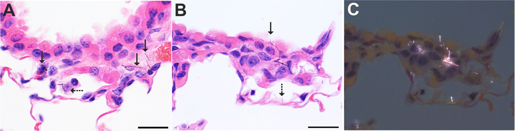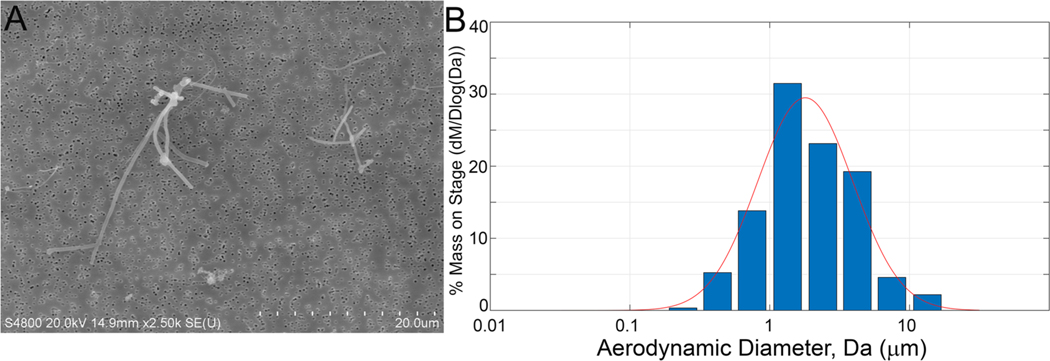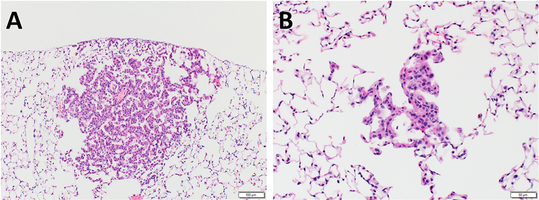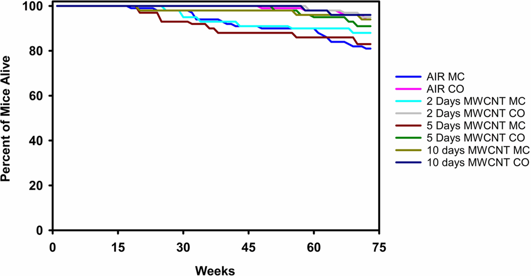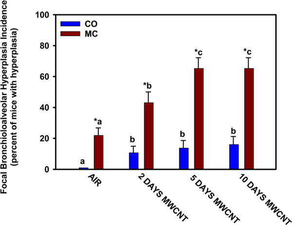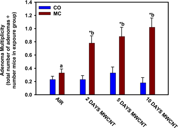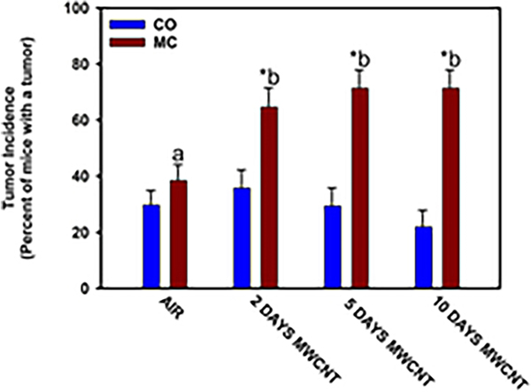 Description:In the lung, carcinogenesis is a multi-stage process that includes initiation by a genotoxic agent, promotion that expands the population of cells with damaged DNA to form a tumor, and progression from benign to malignant neoplasms. We have previously shown that Mitsui-7, a long and rigid multi-walled carbon nanotube (MWCNT), promotes pulmonary carcinogenesis in a mouse model. To investigate the potential exposure threshold and dose-response for tumor promotion by this MWCNT, 3-methylcholanthrene (MC) initiated (10 μg/g, i.p., once) or vehicle (corn oil) treated B6C3F1 mice were exposed by inhalation to filtered air or MWCNT (5 mg/m|) for 5 h/day for 0, 2, 5, or 10 days and were followed for 17 months post-exposure for evidence of lung tumors. Pulmonary neoplasia incidence in MC-initiated mice significantly increased with each MWCNT exposure duration. Exposure to either MC or MWCNT alone did not affect pulmonary neoplasia incidence compared with vehicle controls. Lung tumor multiplicity in MC-initiated mice also significantly increased with each MWCNT exposure duration. Thus, a significantly higher lung tumor multiplicity was observed after a 10-day MWCNT exposure than following a 2-day exposure. Both bronchioloalveolar adenoma and bronchioloalveolar adenocarcinoma multiplicity in MC-initiated mice were significantly increased following 5- and 10-day MWCNT exposure, while a 2-day MWCNT exposure in MC-initiated mice significantly increased the multiplicity of adenomas but not adenocarcinomas. In this study, even the lowest MWCNT exposure promoted lung tumors in MC-initiated mice. Our findings indicate that exposure to this MWCNT strongly promotes pulmonary carcinogenesis.