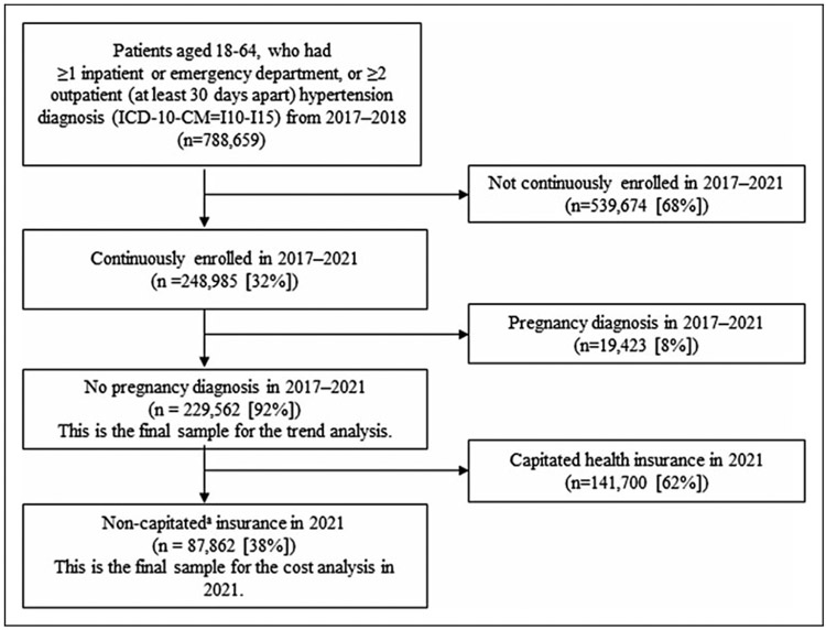 Using MarketScan® Medicaid database, we examined outpatient visits among people with hypertension aged 18–64 years. We presented the numbers of hypertension-related telehealth and in-person outpatient visits per 100 individuals and the proportion of hypertension-related telehealth outpatient visits to total outpatient visits by month, overall, and by race and ethnicity. For the cost analysis, we presented total and patient out-of-pocket (OOP) costs per visit for telehealth and in-person visits in 2021.