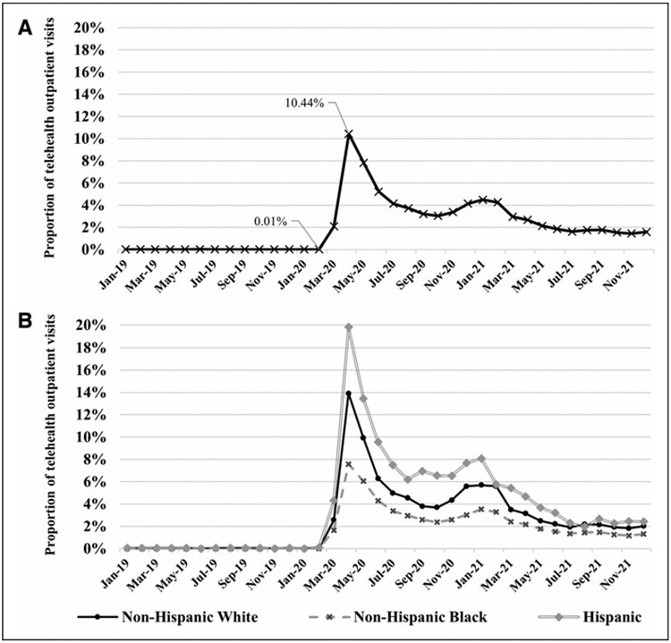 Of the 229,562 individuals, 114,445 (49.9%) were non-Hispanic White, 80,692 (35.2%) were non-Hispanic Black, 3,924 (1.71%) were Hispanic. From February to April 2020, the number of hypertension-related telehealth outpatient visits per 100 persons increased from 0.01 to 6.13, the number of hypertension-related in-person visits decreased from 61.88 to 52.63, and the proportion of hypertension-related telehealth outpatient visits increased from 0.01% to 10.44%. During that same time, the proportion increased from 0.02% to 13.9% for non-Hispanic White adults, from 0.00% to 7.58% for non-Hispanic Black adults, and from 0.12% to 19.82% for Hispanic adults. The average total and patient OOP costs per visit in 2021 were $83.82 (95% confidence interval [CI], 82.66–85.05) and $0.55 (95% CI, 0.42–0.68) for telehealth and $264.48 (95% CI, 258.87–269.51) and $0.72 (95% CI, 0.65–0.79) for in-person visits, respectively.