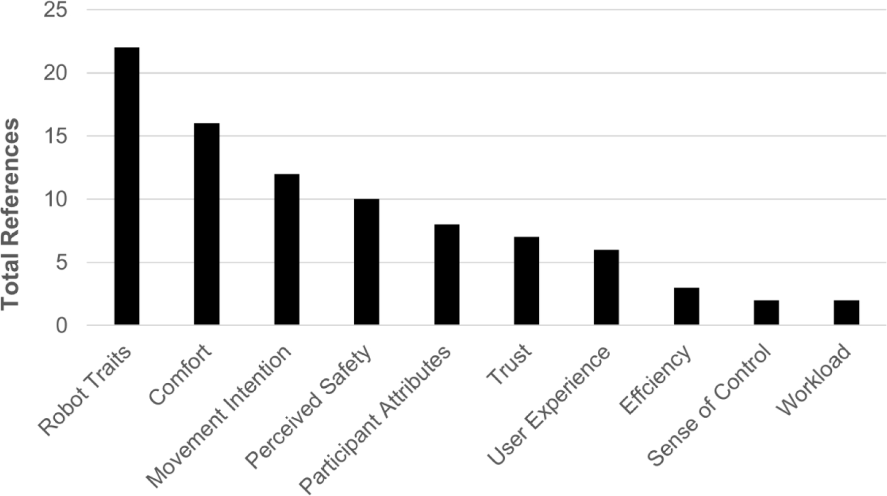 Almost all of the reported experiments were conducted in a controlled laboratory setting. There were 27 different types of autonomous mobile robots. Only two studies involved industrial mobile robots that were commercially available and could be implemented in an industrial environment. Most studies used questionnaires, with the most common topic relating to participant perceptions of various robot traits, while few directly evaluated perceived safety and trust using questionnaires. Behavioral and physiological assessment methods were used in 70 and 8% of the studies, respectively. Separation distance between the participant and robot was the most common behavioral assessment method. A variety of robot characteristics were found to have a significant effect on human perception of safety and other similar concepts.