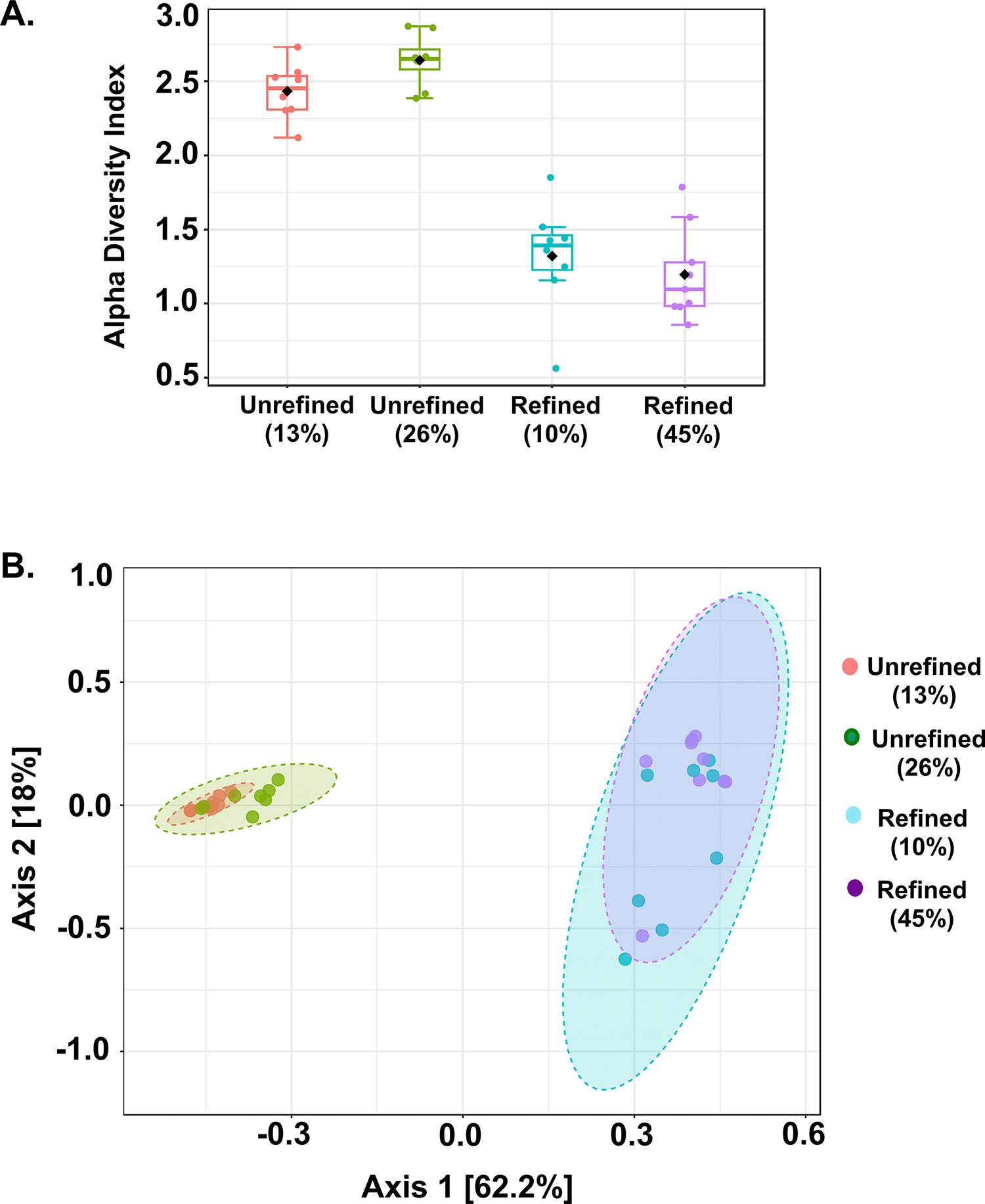 Female NOD mice were fed either unrefined diets or matched refined low- and high-fat diets. The onset of hyperglycemia, glucose tolerance, food intake, energy expenditure, circulating insulin, liver gene expression, and microbiome changes were measured for each dietary group.