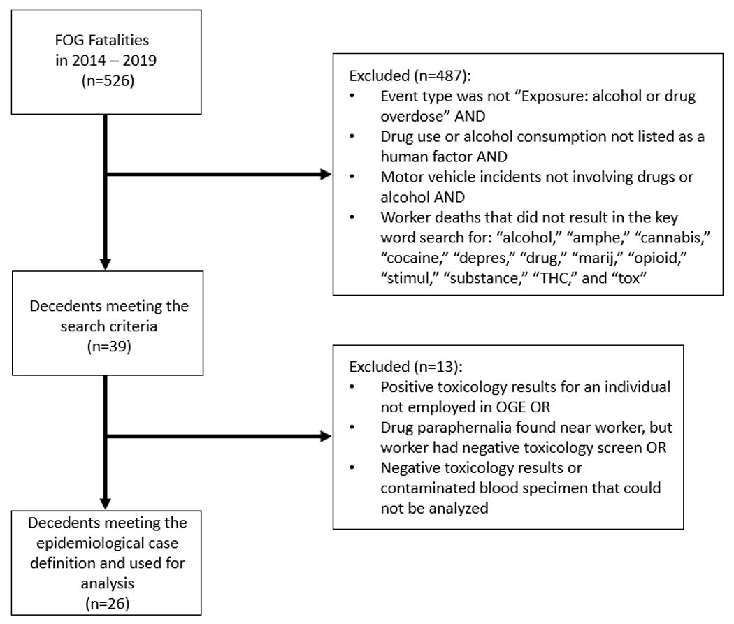 The National Institute for Occupational Safety and Health’s Fatalities in Oil and Gas database was screened for fatalities involving substance use from 2014 through 2019.