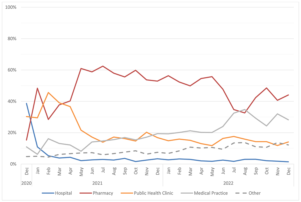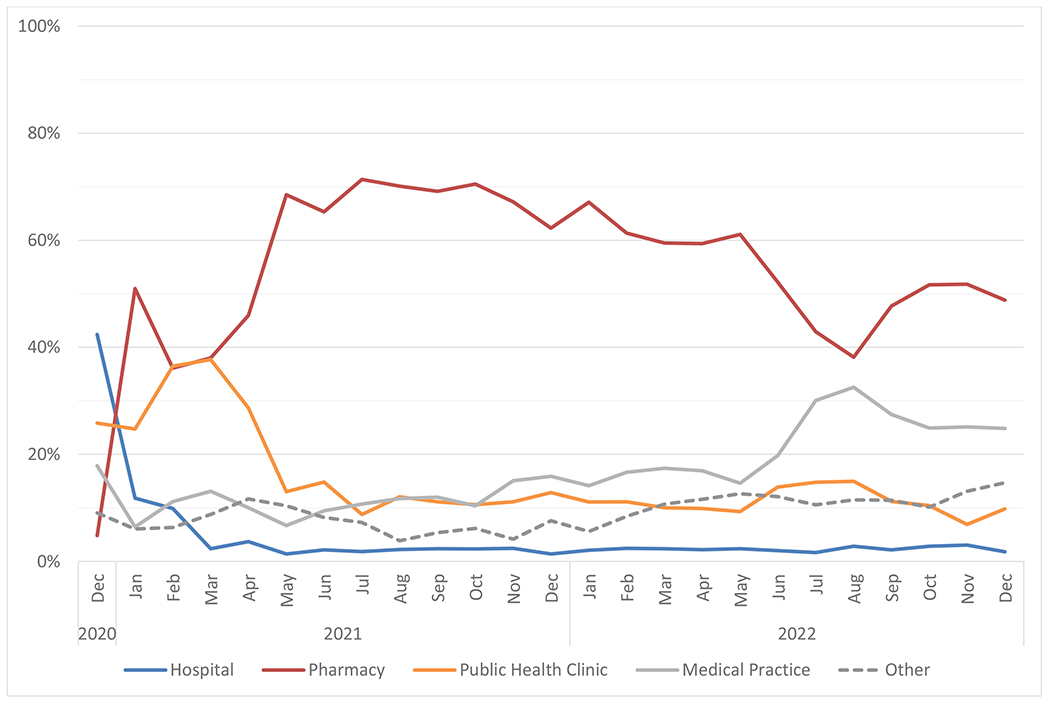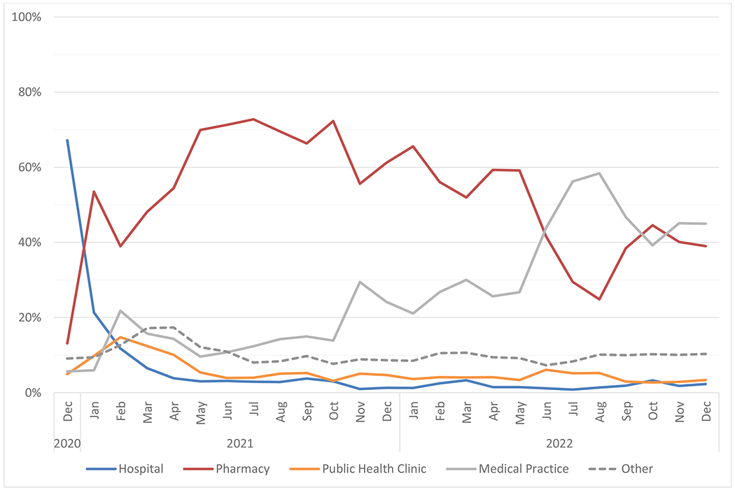 Our goal was to compare locations of COVID-19 vaccine provision in urban and rural communities over the course of the pandemic.