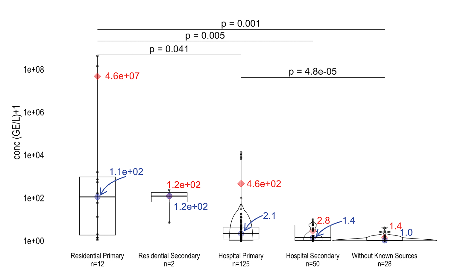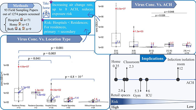 Description:As SARS-CoV-2 swept across the globe, increased ventilation and implementation of air cleaning were emphasized by the US CDC and WHO as important strategies to reduce the risk of inhalation exposure to the virus. To assess whether higher ventilation and air cleaning rates lead to lower exposure risk to SARS-CoV-2, 1274 manuscripts published between April 2020 and September 2022 were screened using key words "airborne SARS-CoV-2 or "SARS-CoV-2 aerosol". Ninety-three studies involved air sampling at locations with known sources (hospitals and residences) were selected and associated data were compiled. Two metrics were used to assess exposure risk: SARS-CoV-2 concentration and SARS-CoV-2 detection rate in air samples. Locations were categorized by type (hospital or residence) and proximity to the sampling location housing the isolated/quarantined patient (primary or secondary). The results showed that hospital wards had lower airborne virus concentrations than residential isolation rooms. A negative correlation was found between airborne virus concentrations in primary-occupancy areas and air changes per hour (ACH). In hospital settings, sample positivity rates were significantly reduced in secondary-occupancy areas compared to primary-occupancy areas, but they were similar across sampling locations in residential settings. ACH and sample positivity rates were negatively correlated, though the effect was diminished when ACH values exceeded 8. While limitations associated with diverse sampling protocols exist, data considered by this meta-analysis support the notion that higher ACH may reduce exposure risks to the virus in ambient air.
