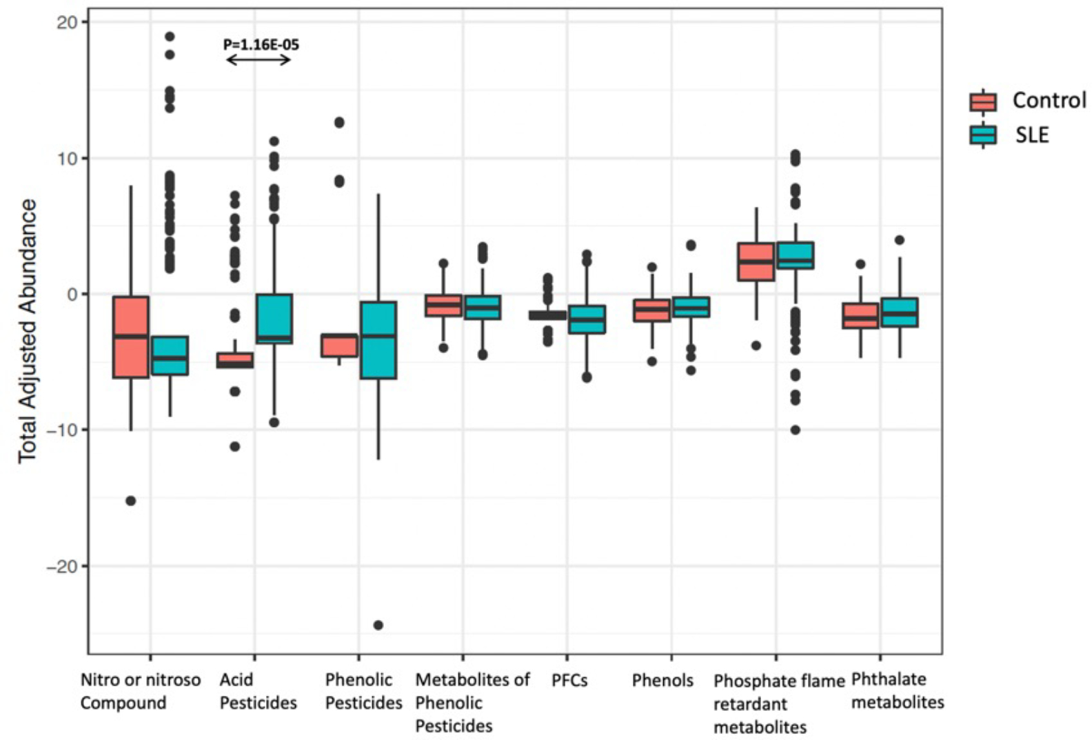 We found 30 features significantly associated with SLE status (Bonferroni p<0.05). Of these, 7 matched chemical names based on databases. These seven features included phthalate metabolites, a formetanate metabolite, and eugenol. The abundance of acid pesticides differed between SLE cases and controls (Bonferroni p<0.05). Two unmatched features were associated with a history of lupus nephritis, and one with anti-double-stranded DNA antibody production (Bonferroni p< 0.05). Seventeen features varied by self-reported race and ethnicity, including a polyfluoroalkyl substance (ANOVA p < 1.69E-05). Eleven features correlated with antimalarials, 6 with mycophenolate mofetil, and 29 with prednisone use.