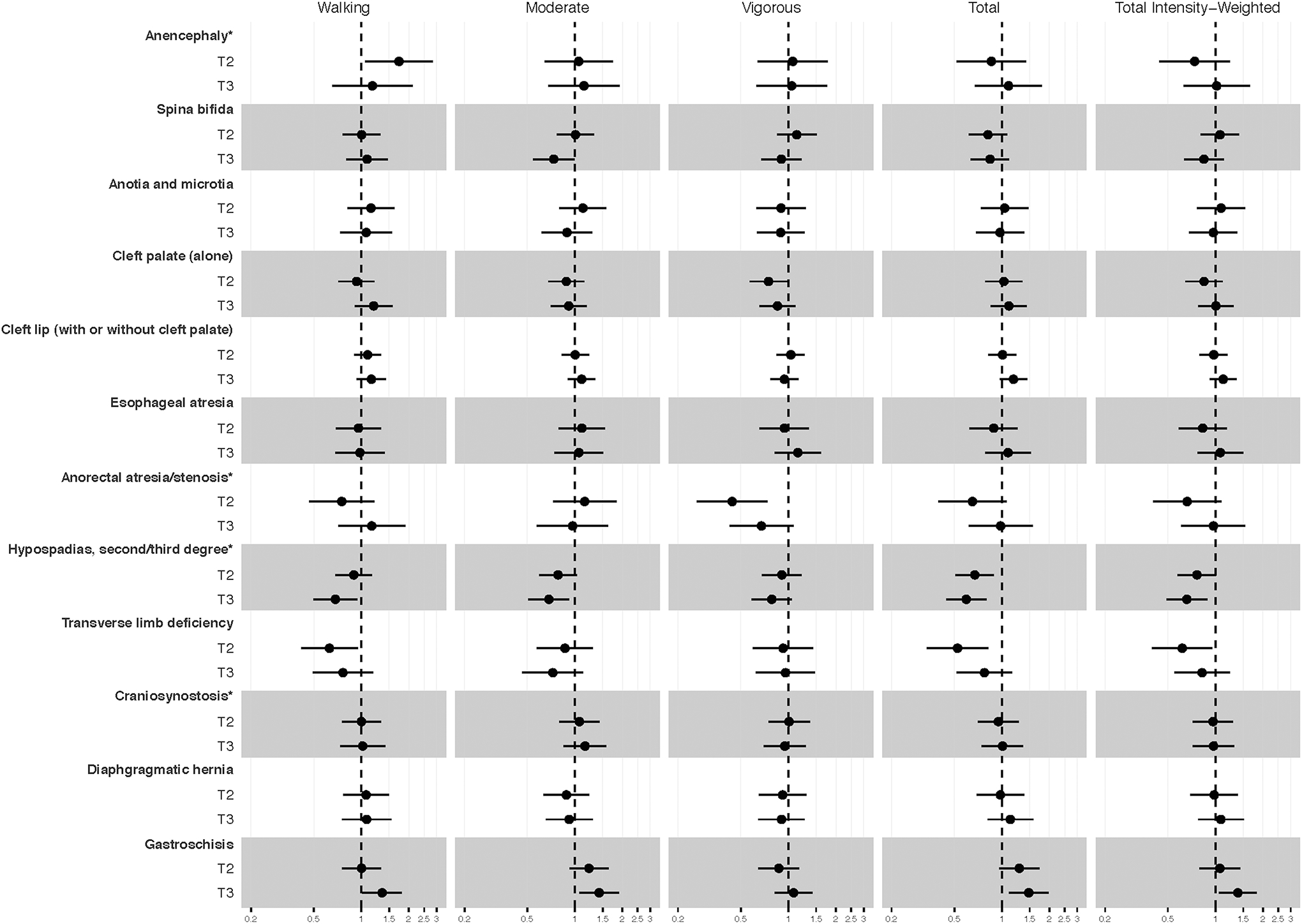 Mothers engaging in pre-pregnancy PA was associated with a reduced odds of five (spina bifida, cleft palate, anorectal atresia, hypospadias, transverse limb deficiency) and a higher odds of two (anencephaly, gastroschisis) birth defects. Mothers spending less time sitting in pre-pregnancy was associated with a reduced odds of two (anorectal atresia, hypospadias) and a higher odds of one (cleft lip with or without cleft palate) birth defect.