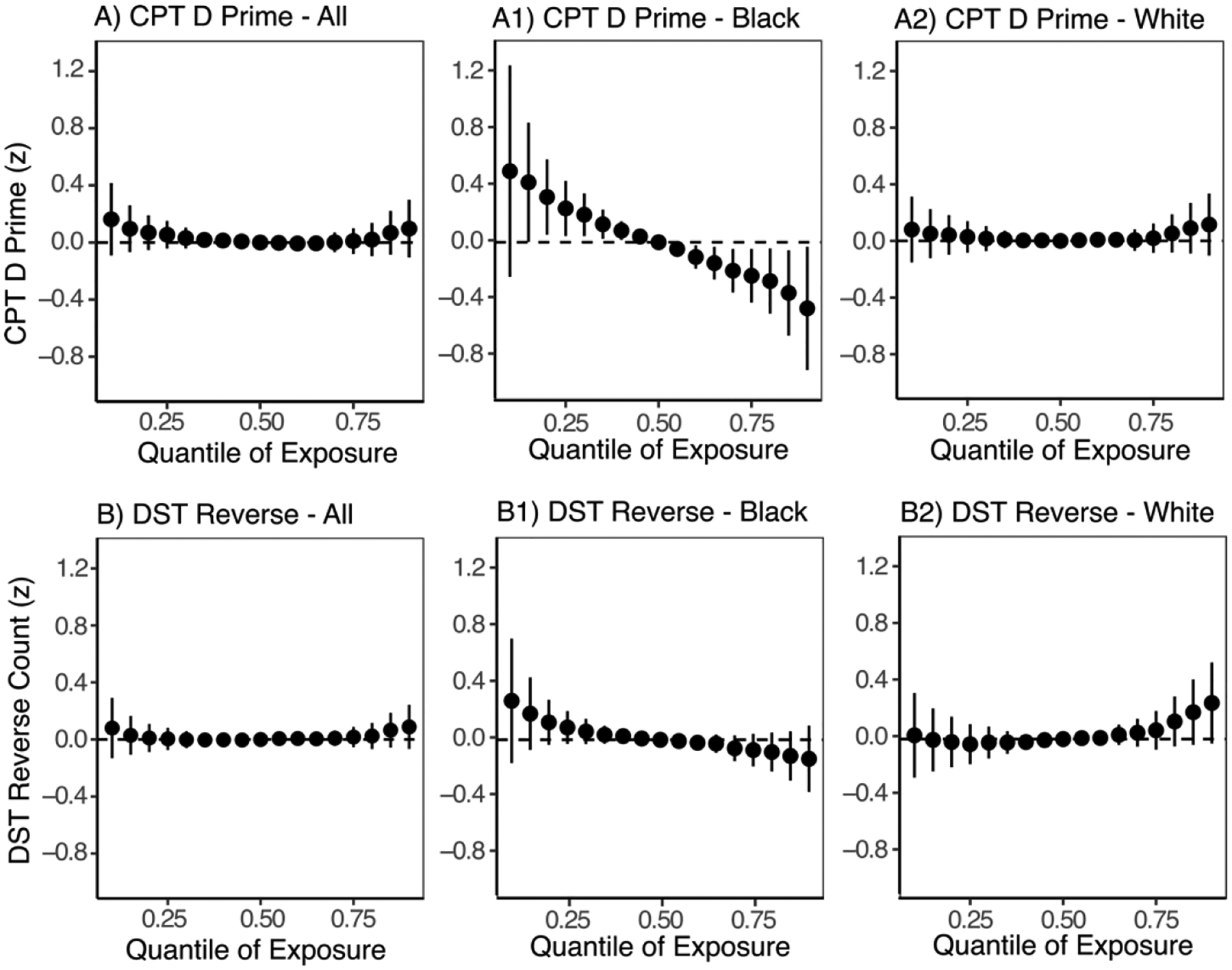 Adjusting for other metals, one interquartile range (IQR) increase in toenail chromium was associated with a 0.19 (95% CI: −0.31, −0.07) point reduction in CPT D Prime score (poorer ability to discriminate test signals from noise). One IQR increase in toenail manganese was associated with a 0.20 (95% CI: −0.41, 0.01) point reduction on the DST Reverse Count (fewer numbers recalled). Attention deficits were greater among Black participants compared to White participants for the same increase in toenail chromium concentrations. No evidence of synergistic interaction between metals or adverse effect of the overall metal mixture was observed for either outcome.