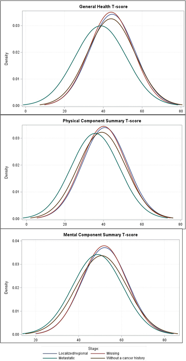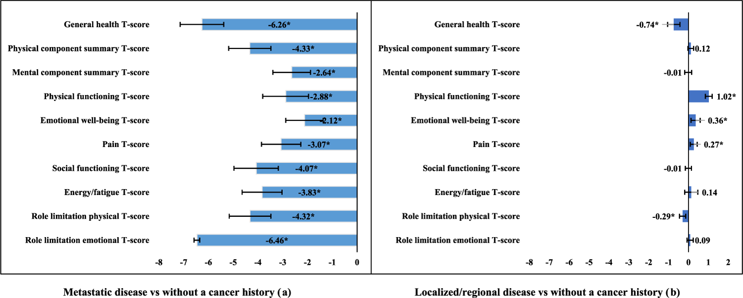 Compared to men without a cancer history, prostate cancer survivors were older, more likely to be married, and had higher socioeconomic status. Compared to men without a cancer history, metastatic prostate cancer survivors reported lower general health (T-score differences [95% confidence interval]: − 6.26, [− 7.14, − 5.38], p < .001), physical health (− 4.33, [− 5.18, − 3.48], p < .001), and mental health (− 2.64, [− 3.40, − 1.88], p < .001) component summaries. Results were similar for other VR-12 T-scores. In contrast, non-metastatic prostate cancer survivors reported similar VR-12 T-scores as men without a cancer history. Further analyses comparing metastatic and non-metastatic prostate cancer survivors support these findings.