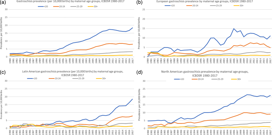 Overall, gastroschisis occurred in 1 of every 3268 births (3.06 per 10,000 births; 95% confidence intervals [CI]: 3.01, 3.11), with marked regional variation. European+ prevalence was 1.49 (95%CI: 1.44, 1.55), Latin American 3.80 (95%CI: 3.69, 3.92) and North American 4.32 (95%CI: 4.22, 4.42). A statistically significant increasing time trend was observed among six European+, four Latin American, and four North American programs. Women <20 years of age had the highest prevalence in all programs except the Slovak Republic.