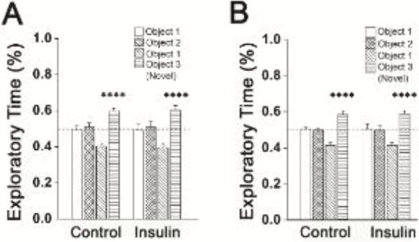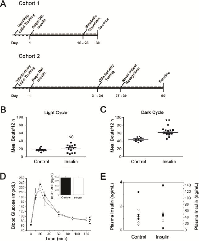 Description:Intranasal insulin delivery is currently being used in clinical trials to test for improvement in human memory and cognition, and in particular, for lessening memory loss attributed to neurodegenerative diseases. Studies have reported the effects of short-term intranasal insulin treatment on various behaviors, but less have examined long-term effects. The olfactory bulb contains the highest density of insulin receptors in conjunction with the highest level of insulin transport within the brain. Previous research from our laboratory has demonstrated that acute insulin intranasal delivery (IND) enhanced both short- and long-term memory as well as increased two-odor discrimination in a two-choice paradigm. Herein, we investigated the behavioral and physiological effects of chronic insulin IND. Adult, male C57BL6/J mice were intranasally treated with 5μg/μl of insulin twice daily for 30 and 60days. Metabolic assessment indicated no change in body weight, caloric intake, or energy expenditure following chronic insulin IND, but an increase in the frequency of meal bouts selectively in the dark cycle. Unlike acute insulin IND, which has been shown to cause enhanced performance in odor habituation/dishabituation and two-odor discrimination tasks in mice, chronic insulin IND did not enhance olfactometry-based odorant discrimination or olfactory reversal learning. In an object memory recognition task, insulin IND-treated mice did not perform differently than controls, regardless of task duration. Biochemical analyses of the olfactory bulb revealed a modest 1.3 fold increase in IR kinase phosphorylation but no significant increase in Kv1.3 phosphorylation. Substrate phosphorylation of IR kinase downstream effectors (MAPK/ERK and Akt signaling) proved to be highly variable. These data indicate that chronic administration of insulin IND in mice fails to enhance olfactory ability, object memory recognition, or a majority of systems physiology metabolic factors - as reported to elicit a modulatory effect with acute administration. This leads to two alternative interpretations regarding long-term insulin IND in mice: 1) It causes an initial stage of insulin resistance to dampen the behaviors that would normally be modulated under acute insulin IND, but ability to clear a glucose challenge is still retained, or 2) There is a lack of behavioral modulation at high concentration of insulin attributed to the twice daily intervals of hyperinsulinemia caused by insulin IND administration without any insulin resistance, per se.