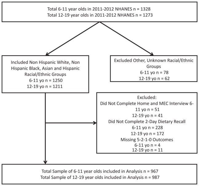 The National Health and Nutrition Examination Survey (2011–2012) data were used. The study sample included Hispanic (n = 608), non-Hispanic black (n = 609), Asian (n = 253), and non-Hispanic white (n = 484) youth 6–19 years old. The 5-2-1-0 targets were assessed using 24-hour dietary recalls, the Global Physical Activity Questionnaire, and sedentary behavior items. Outcomes included meeting all targets, no targets, and individual targets. Multivariable logistic regression models accounting for the complex sampling design were used to evaluate the association of race/ethnicity with each outcome among children and adolescents separately.