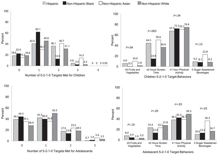 None of the adolescents and <1% of children met all 4 of the 5-2-1-0 targets, and 19% and 33%, of children and adolescents, respectively, met zero targets. No racial/ethnic differences in meeting zero targets were observed among children. Hispanic (aOR, 1.76 [95% CI, 1.04–2.98]), non-Hispanic black (aOR, 1.82 [95% CI, 1.04–3.17]), and Asian (aOR, 1.48 [95% CI, 1.08–2.04]) adolescents had greater odds of meeting zero targets compared with non-Hispanic whites. Racial/ethnic differences in meeting individual targets were observed among children and adolescents.