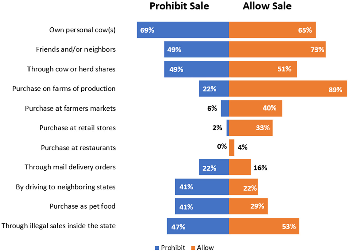 Consumption of unpasteurized milk can result in severe illness or death. In the United States, the number of people who regularly consume unpasteurized milk is relatively low, but outbreaks resulting from unpasteurized milk outnumber outbreaks linked to pasteurized milk. The sale of unpasteurized milk for human consumption through interstate commerce is prohibited at the federal level, but laws among states vary considerably with respect to the sale of unpasteurized milk. Each state has a different perspective on responding to and preventing outbreaks of illness linked to consuming unpasteurized milk.