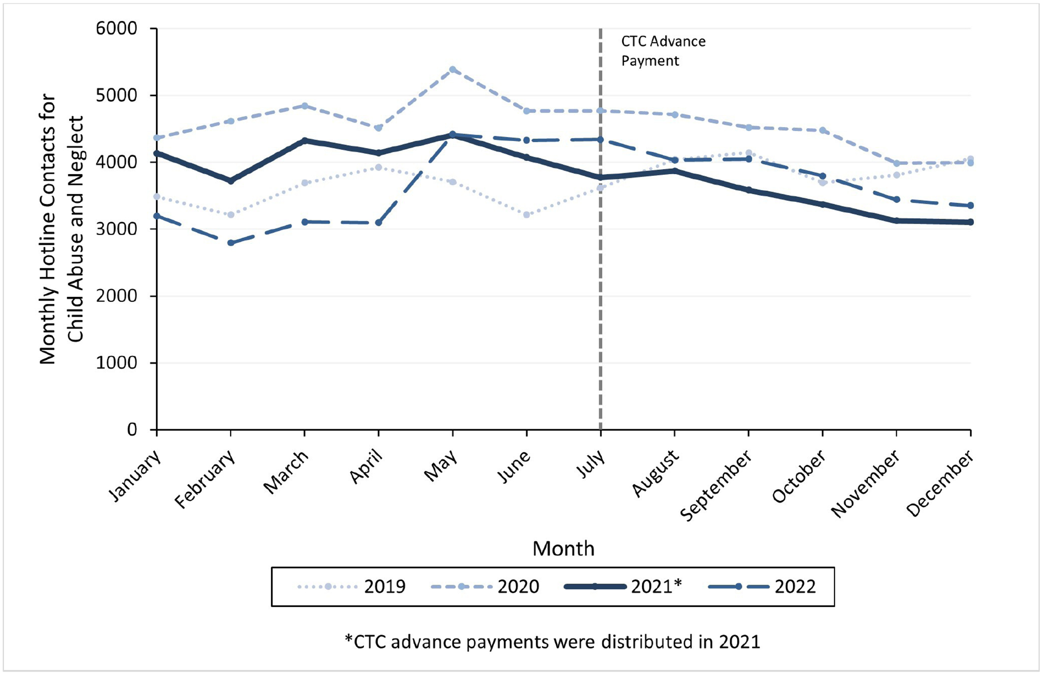 Advanced child tax credit payments and national child abuse hotline contacts, 2019–2022