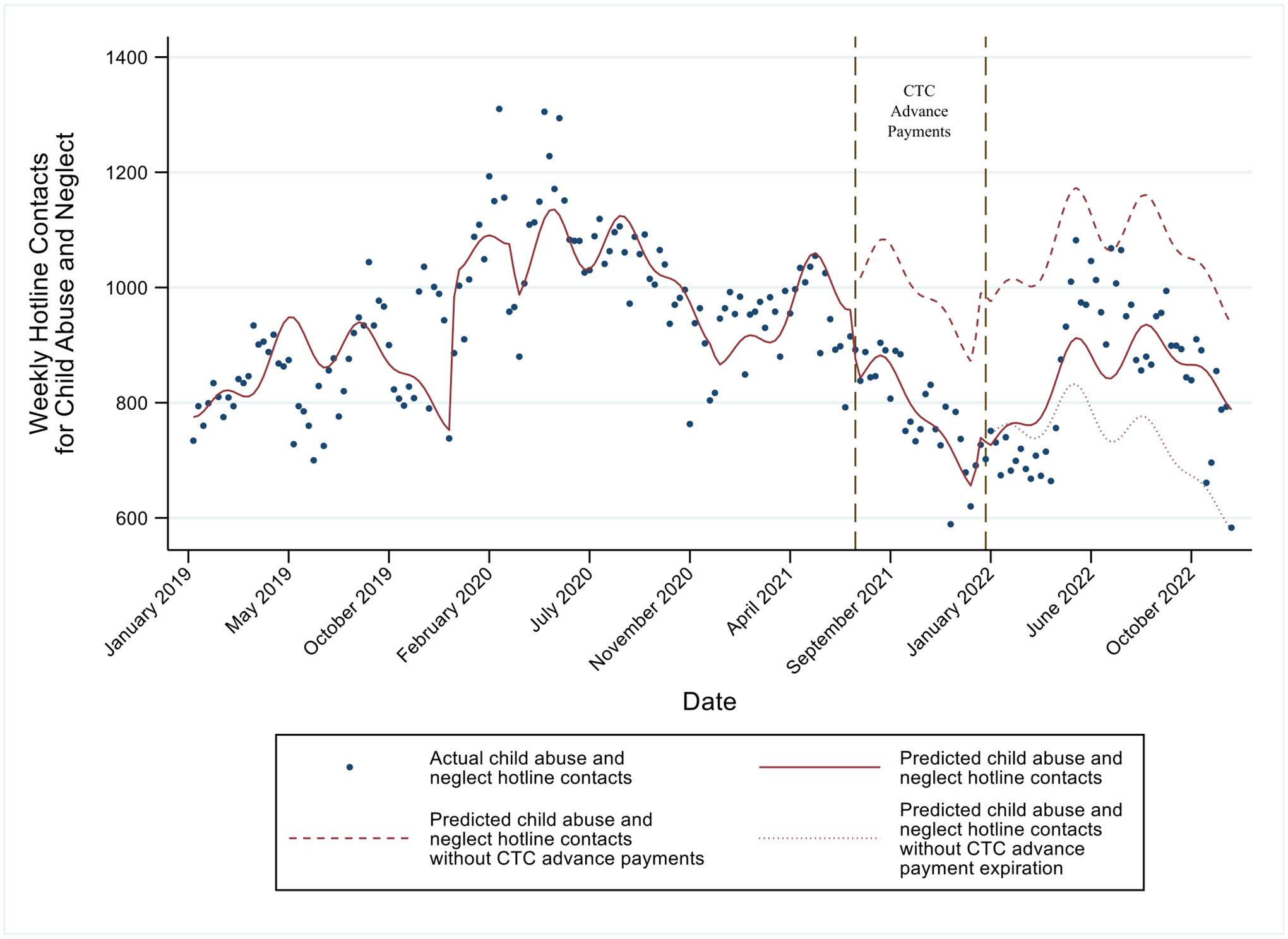 A time series study of contacts to the Childhelp National Child Abuse Hotline between January 2019 and December 2022 was used to examine the association between the payments and hotline contacts. An interrupted time series (ITS) exploiting the variation in the advance CTC payments was estimated using fixed effects.