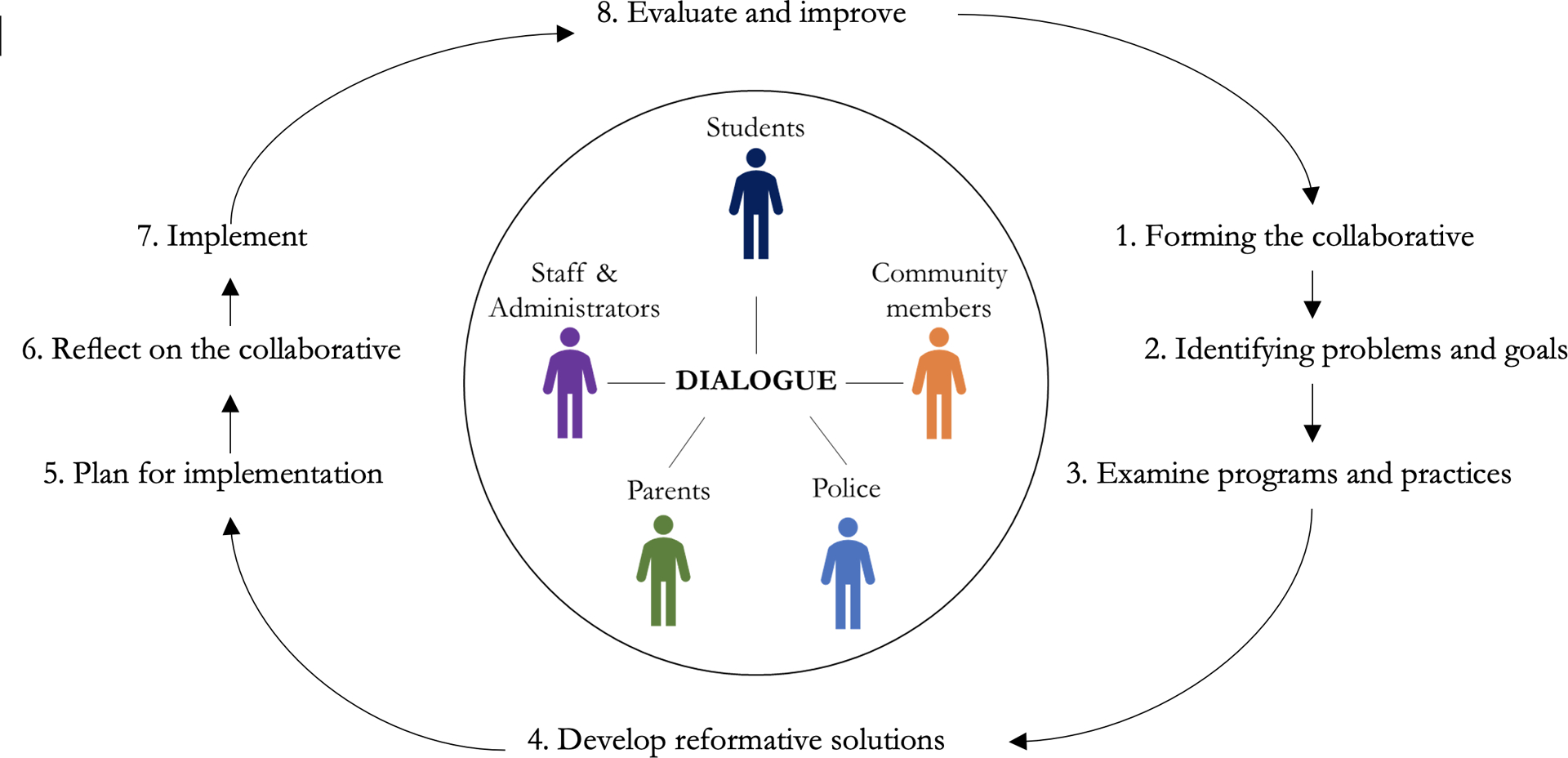School Resource Officer (SRO) programs do not reduce school violence, and increase school discipline. We describe the use of a culturally responsive framework to form a school community collaborative between students, parents, staff, administrators, and law enforcement to reform an SRO program, promote school safety, and reduce punitive measures.