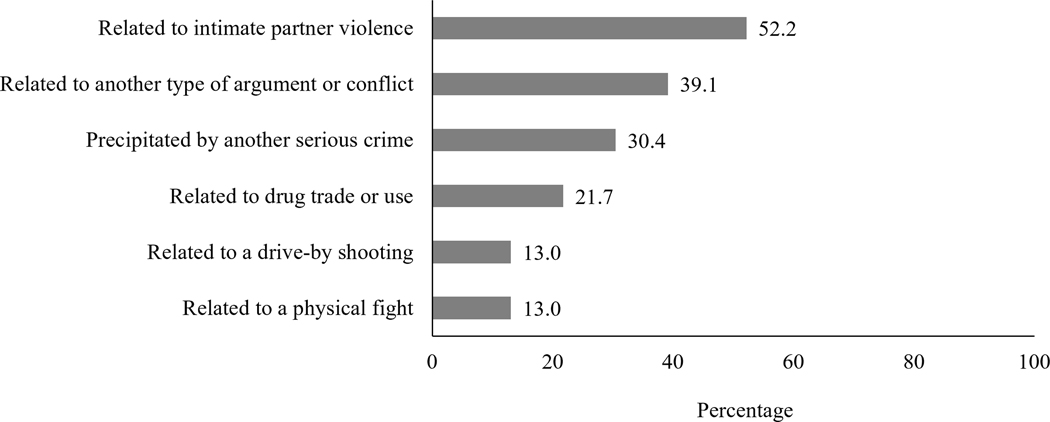 From 2018–2019 in North Carolina, there were 23 homicide, 9 suicide, and 36 unintentional opioid-involved overdose deaths (9.7, 3.8, and 15.1 per 100,000 live births, respectively) during pregnancy and the first year postpartum. Most homicide deaths (87.0%) were by firearm, and more than half (52.5%) were related to IPV. More than two-thirds of women who died by suicide had a current mental health problem (77.8%). Less than one-fourth (22.2%) who died by unintentional opioid-involved overdose had a known history of substance use disorder treatment.