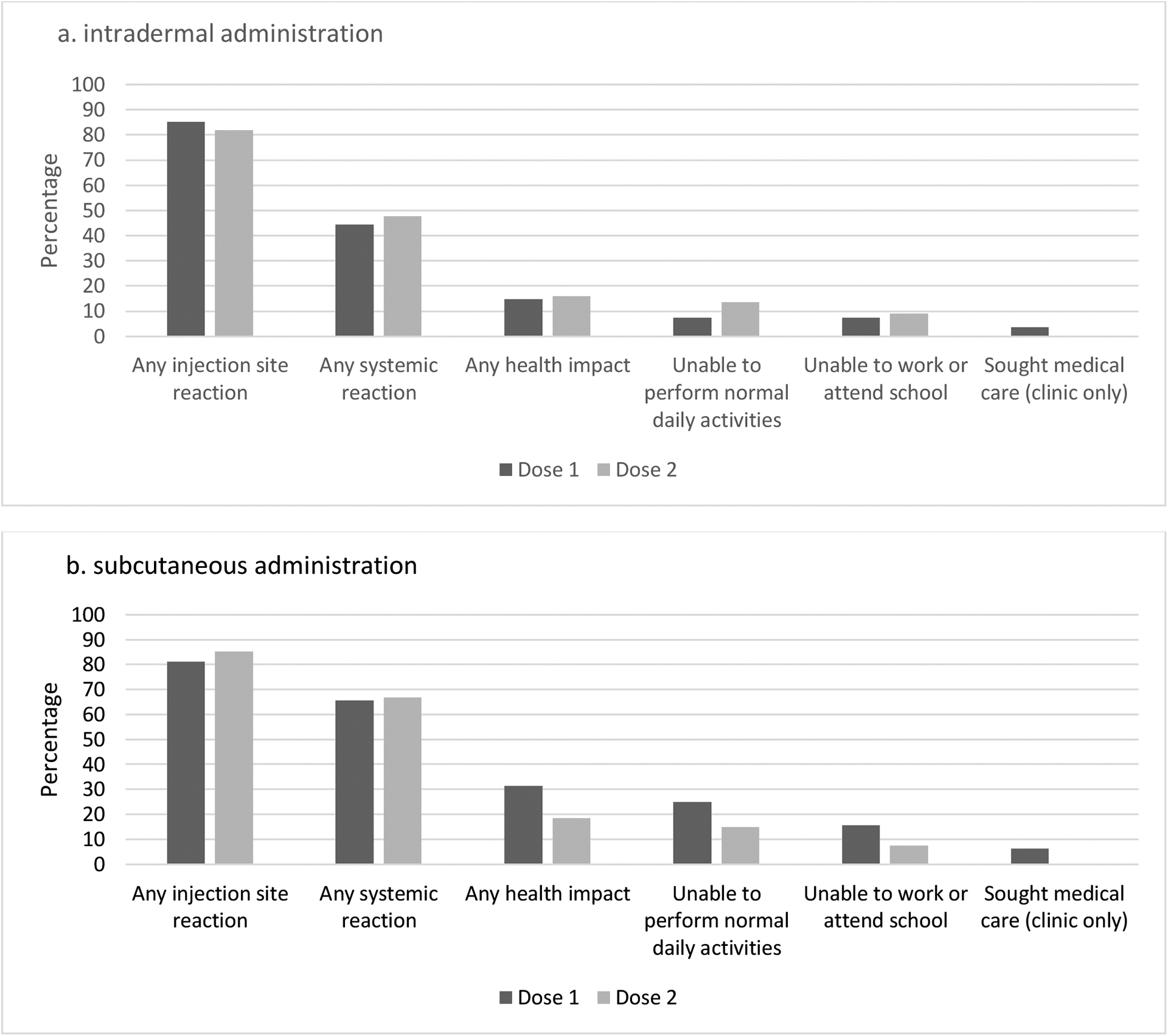 There were 1,207,056 JYNNEOS doses administered in the United States. VAERS received 1,927 reports for JYNNEOS. The myocarditis reporting rate per million doses was 2.69 after dose 1 and 8.64 after dose 2. V-safe had 213 participants complete at least one health survey. Rates of injection site and systemic reactions were similar in the first week following dose 1 and dose 2.