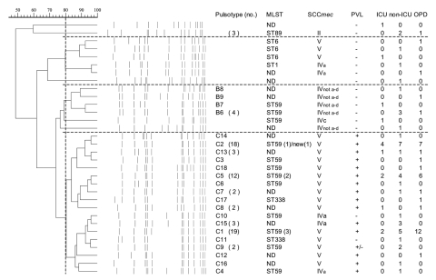 Description:We found a virulent closely related clone (Panton-Valentine leukocidin-positive, SCCmec V:ST59) of methicillin-resistant Staphylococcus aureus in inpatients and outpatients in Taiwan. The isolates were found mostly in wounds but were also detected in blood, ear, respiratory, and other specimens; all were susceptible to ciprofloxacin, gentamicin, and trimethoprim-sulfamethoxazole.