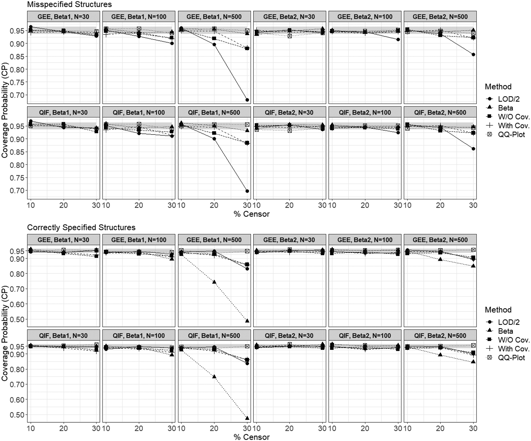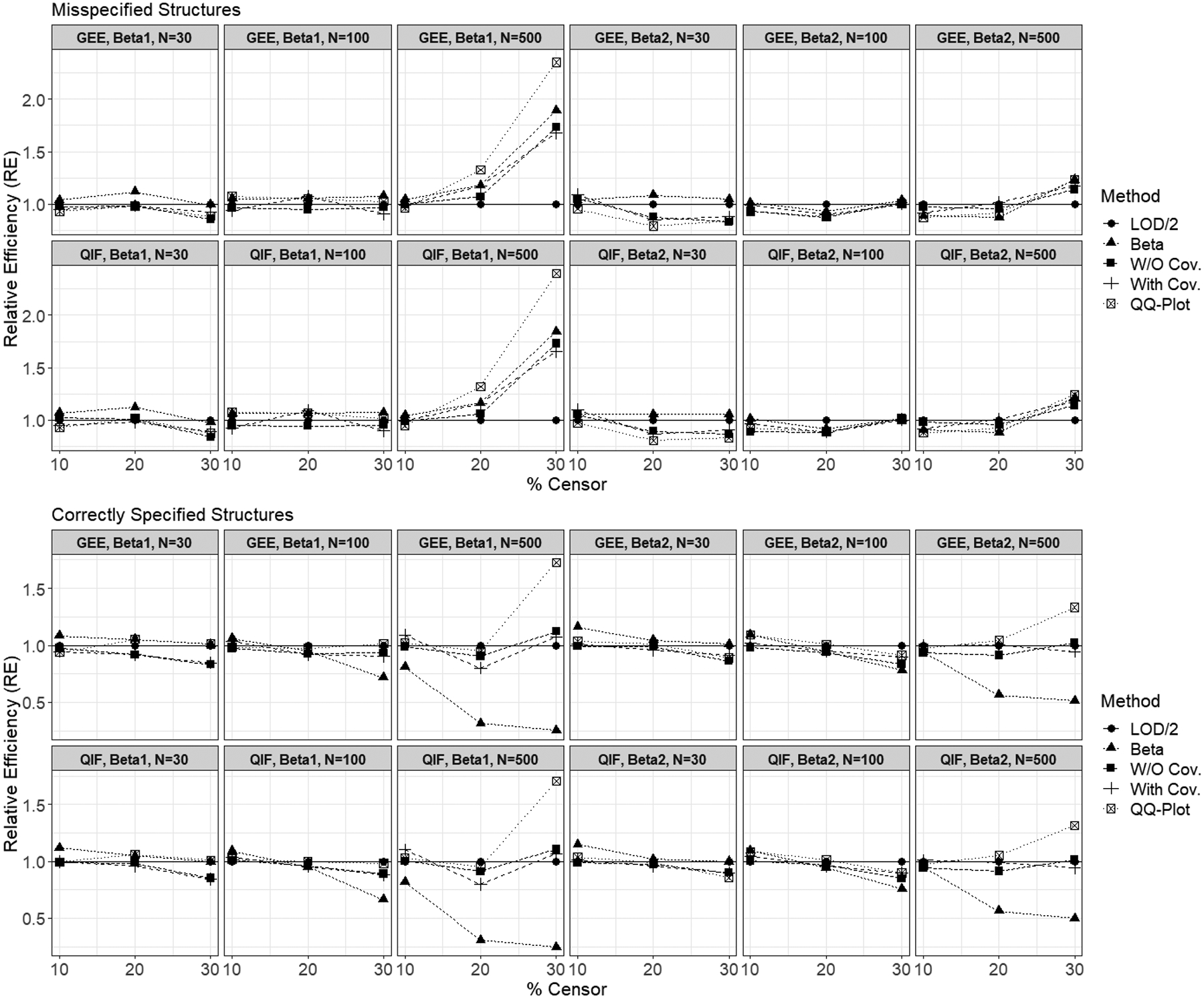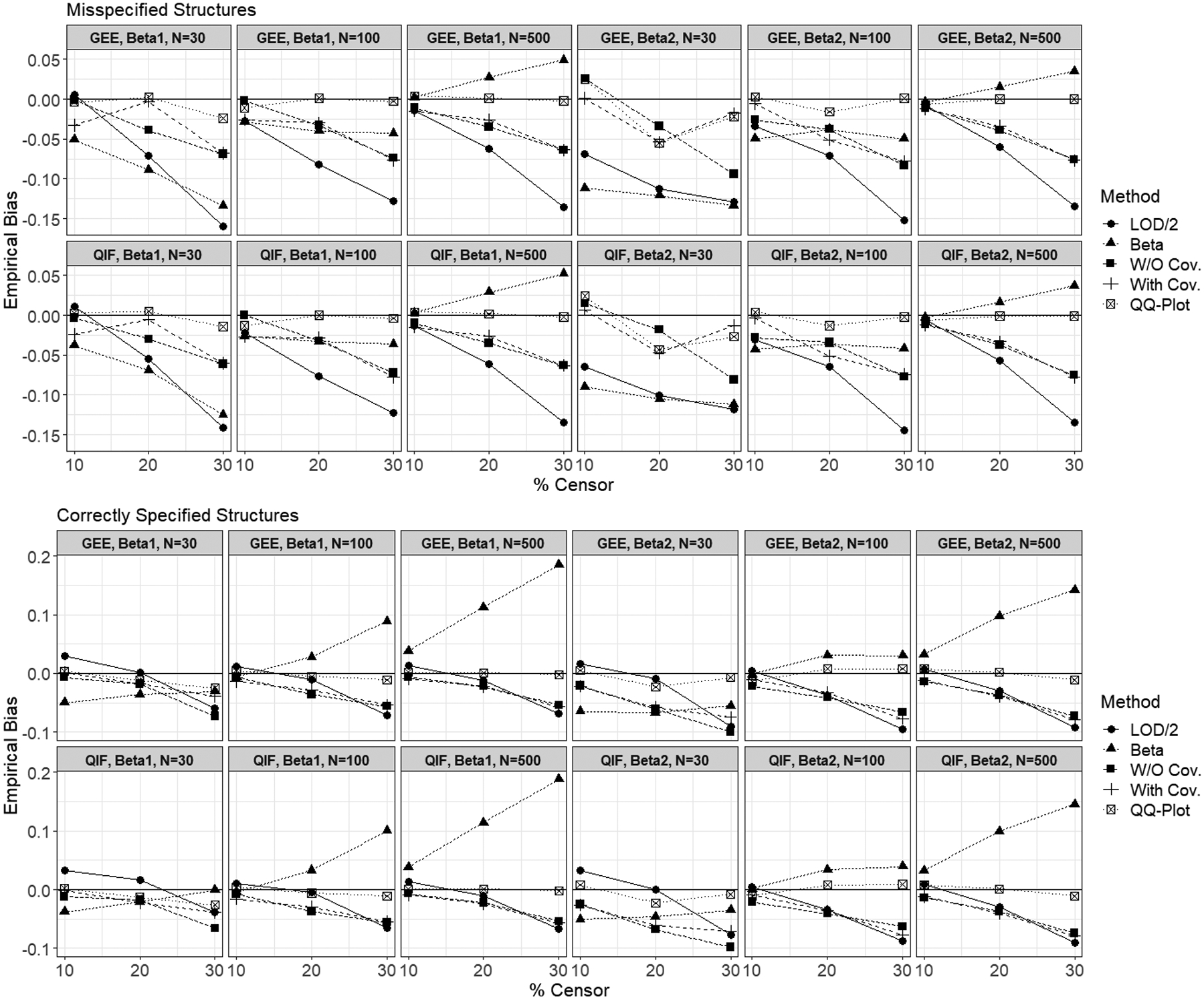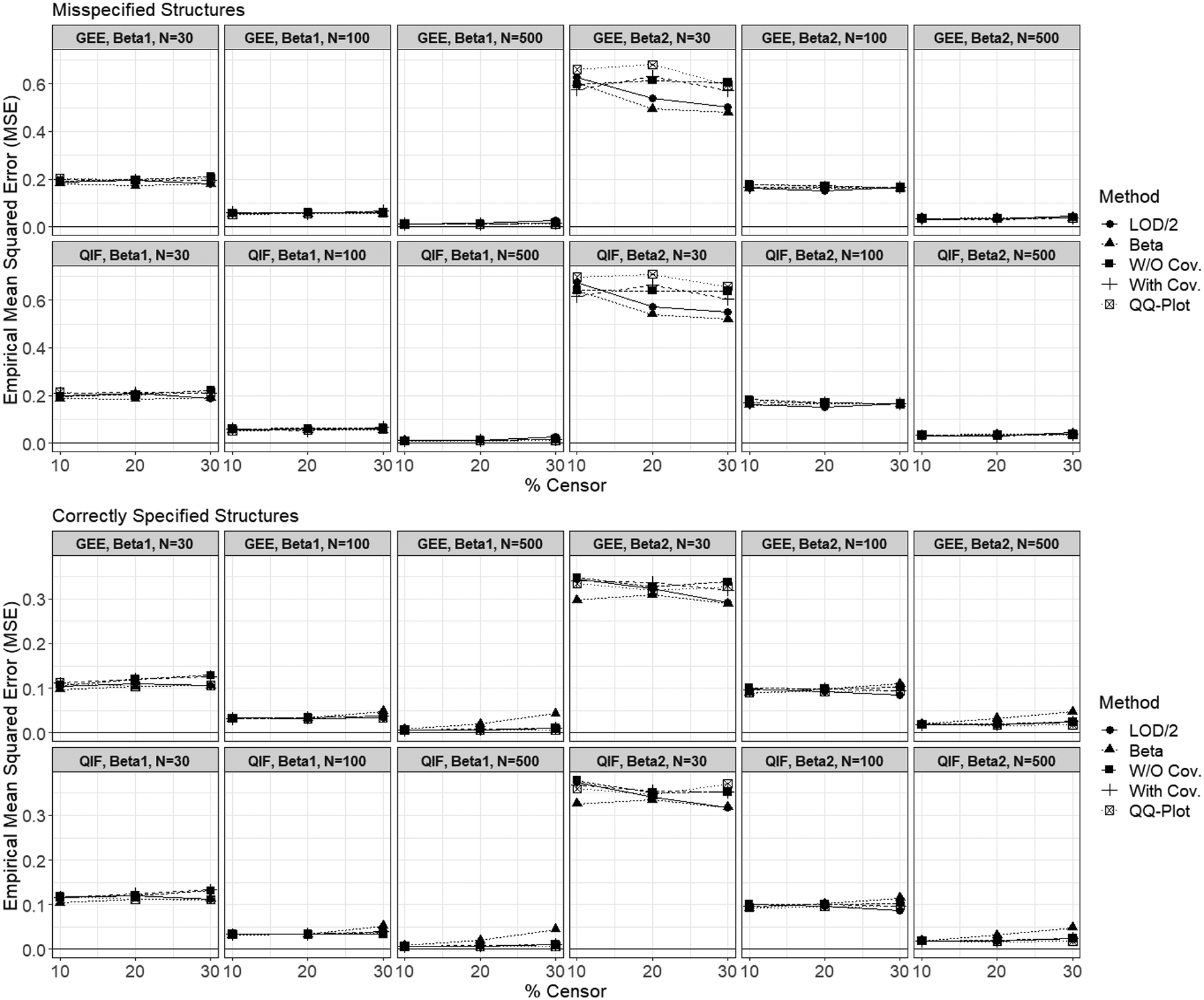 We outlined the theories of three marginal models, i.e., generalized estimating equations (GEE), quadratic inference functions (QIF), and generalized method of moments (GMM). With these approaches, we proposed to incorporate the fill-in methods, including single and multiple value imputation techniques, such that any measurements less than the limit of detection are assigned values.