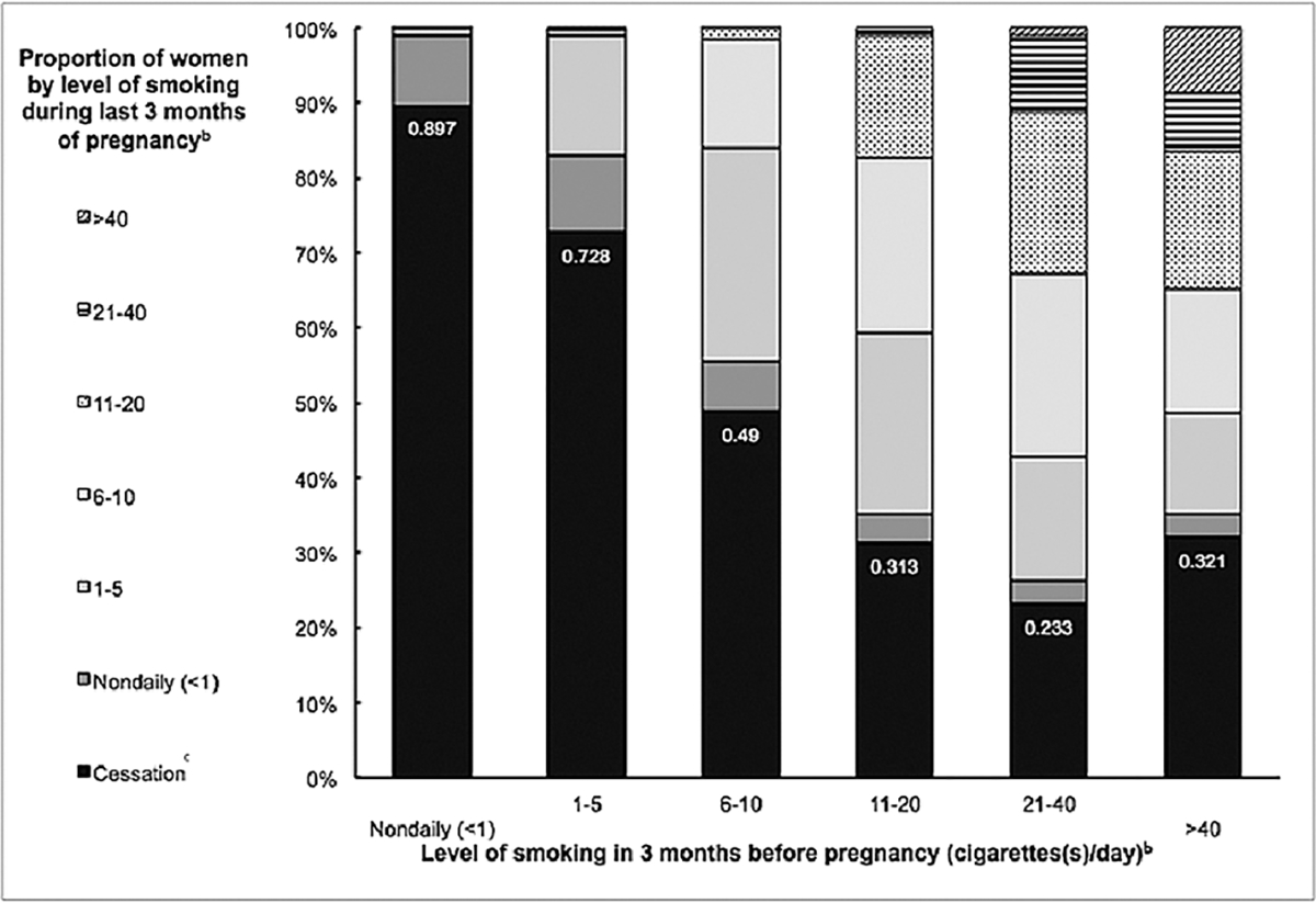 This study aimed to calculate the prevalence of pre-pregnancy nondaily smoking (<1 cigarette/day), risk factors, and report of prenatal provider smoking education; and assess the likelihood of prenatal cessation and postpartum relapse for nondaily smokers.