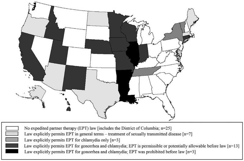 We found no impact (decrease in gonorrhea morbidity) attributable exclusively to the EPT law(s). However, these results do not imply that the EPT laws themselves were not effective (or failed to reduce gonorrhea morbidity), because the effectiveness of the EPT law is dependent on necessary intermediate events/outcomes, including sexually transmitted infection service providers’ awareness and practice, as well as acceptance by patients and their partners.