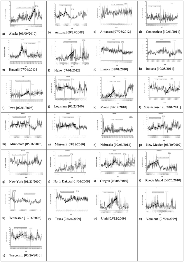 We obtained state-level monthly gonorrhea morbidity (number of cases/100,000 for males, females and total) from the national surveillance data. We used visual examination (of morbidity trends) and an autoregressive time series model in a panel format with intervention (interrupted time series) analysis to assess the impact of state EPT laws based on the months in which the laws were enacted.