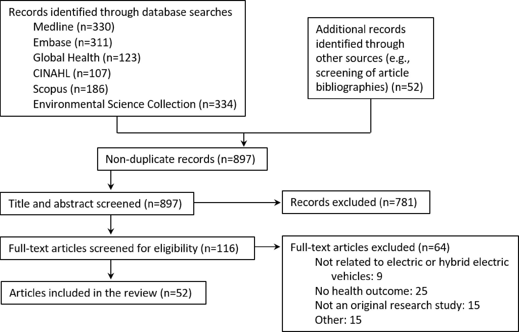 Out of 897 reviewed articles, 52 met our inclusion criteria. The majority of included articles examined transitions to the use of electric vehicles (n=49, 94%), with fewer studies examining hybrid electric vehicles (n=11, 21%) or plug-in hybrid electric vehicles (n=8, 15%). The most common outcomes examined were premature death (n=41, 79%) and monetized health outcomes such as medical expenditures (n=33, 63%). We identified only one observational study on the impact of electric vehicles on health; all other studies reported modeled data. Almost every study (n=51, 98%) reported some evidence of a positive health impact of transitioning to electric or hybrid electric vehicles, although magnitudes of association varied. There was a paucity of information on the environmental justice implications of vehicle transitions.