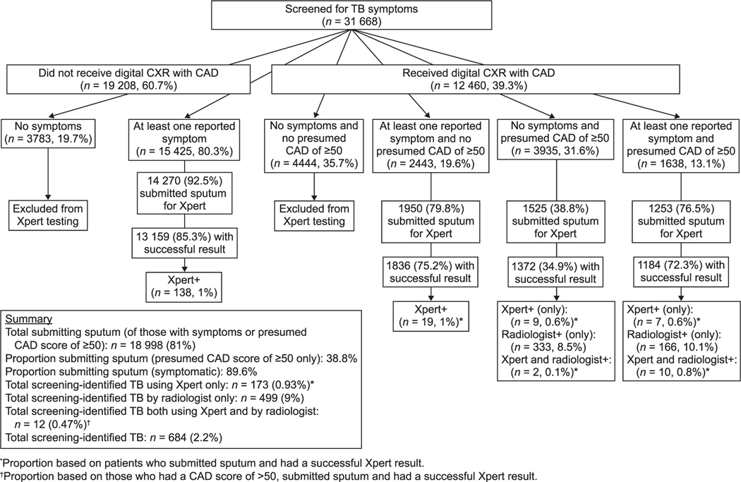 Inmates in 16 South African correctional facilities were screened for TB from January to December 2015. Inmates reporting ≥1 TB symptom or having an abnormal computer-assisted digital chest X-ray (CXR) provided sputum. Abnormal CXRs were interpreted by a radiologist. Sputum was tested for Mycobacterium tuberculosis using Xpert® MTB/RIF. Data from 16 South African correctional facilities were used in regression analysis, and prevalence estimates calculated for 12 South African correctional facilities with >30% screening coverage.