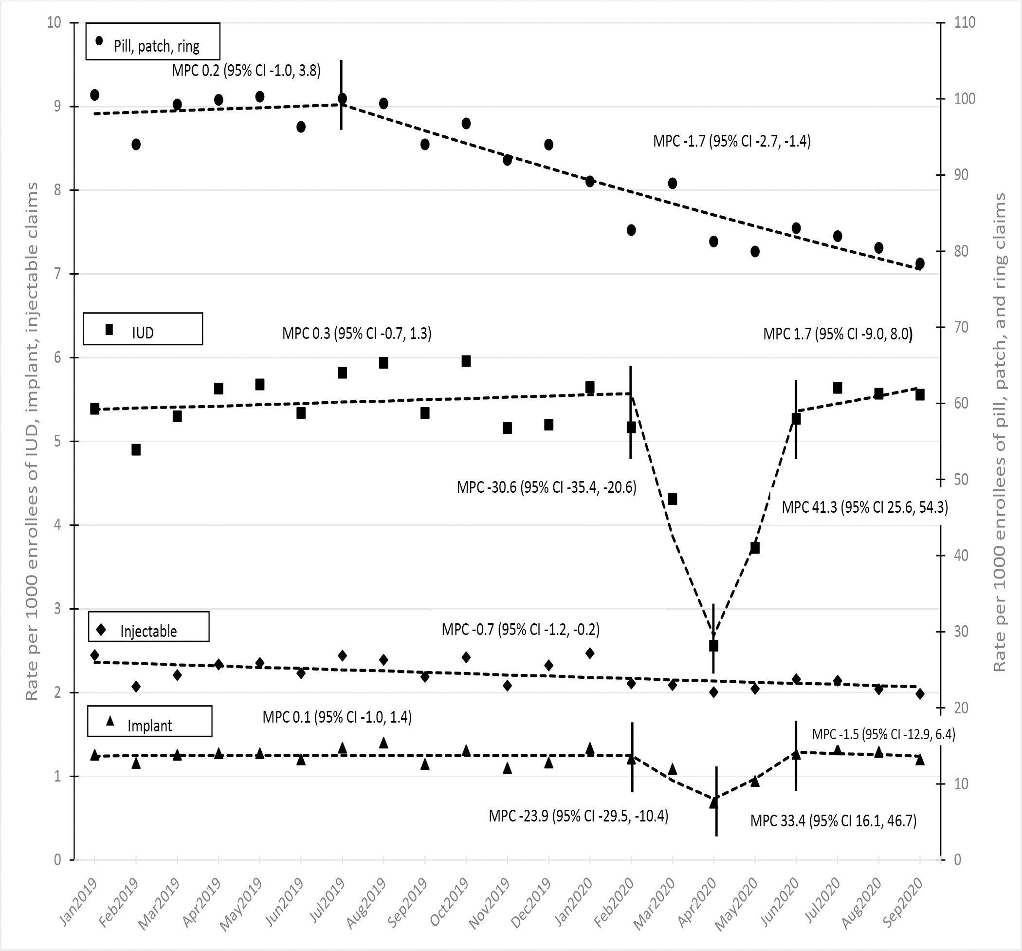 We analyzed commercial insurance claims using IQVIA PharMetrics® Plus data from over 9 million U.S. females aged 15–49 years, enrolled during any month, January 2019–September 2020. We calculated monthly rates of outpatient claims for intrauterine devices (IUDs), implants, and injectable contraception and monthly rates of pharmacy claims for contraceptive pills, patches, and rings. We used Joinpoint regression analysis to identify when statistically significant changes occurred in trends of monthly claims rates for each contraceptive method. We calculated monthly percentages of claims for contraceptive counseling via telehealth.