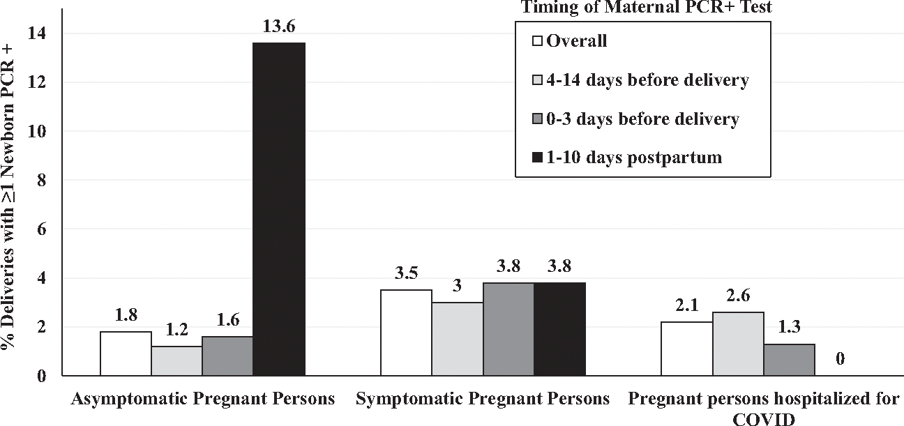 From April 6, 2020 to March 19, 2021, 242 centers in the United States centers reported data for 7524 pregnant persons; at the time of delivery, 78.1% of these persons were asymptomatic, 18.2% were symptomatic but not hospitalized specifically for COVID-19, 3.4% were hospitalized for COVID-19 treatment, and 18 (0.2%) died in the hospital of COVID-related complications. Among 7648 newborns, 6486 (84.8%) were tested for SARS-CoV-2, and 144 (2.2%) were positive; the highest rate of newborn infection was observed when mothers first tested positive in the immediate postpartum period (17 of 125, 13.6%). No newborn deaths were attributable to SARS-CoV-2 infection. Overall, 15.6% of newborns were preterm: among tested newborns, 30.1% of polymerase chain reaction-positive and 16.2% of polymerase chain reaction-negative were born preterm (P < .001). Need for mechanical ventilation did not differ by newborn SARS-CoV-2 test result, but those with positive tests were more likely to be admitted to a NICU.