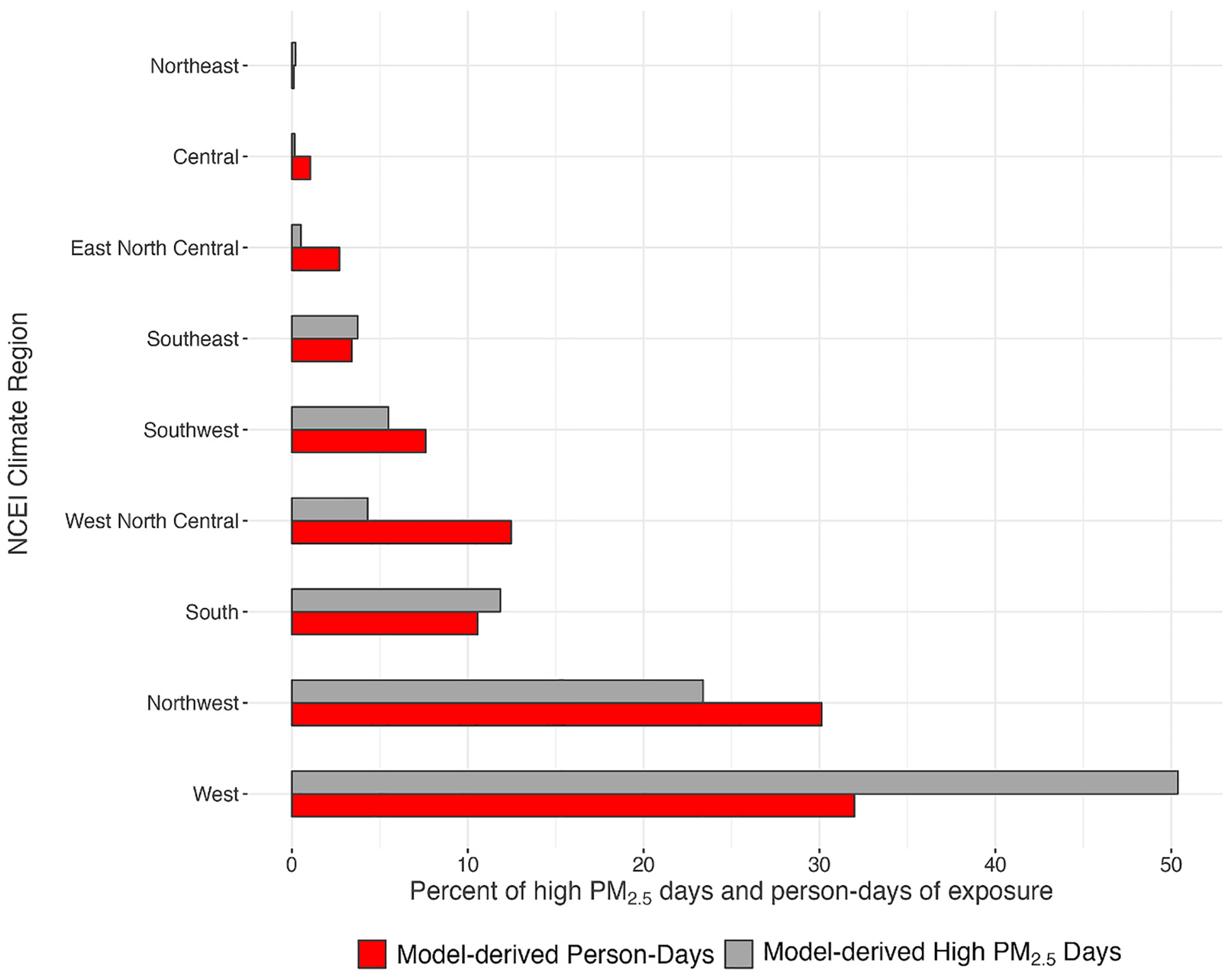 Across all counties in the coterminous United States and for all days, the correlation between county-level model- and monitor-derived PM2.5 estimates was 0.14 (p < 0.001). Correlations were stronger using data from temporary monitors and for areas and days impacted by high wildfire smoke, especially in the western United States. Correlations between county-level model- and monitor-derived estimates in non-metropolitan counties, and at higher concentrations ranged from 0.25 to 0.54 (p < 0.001).